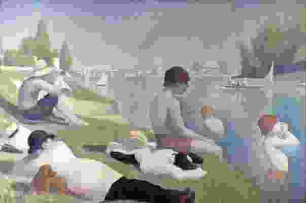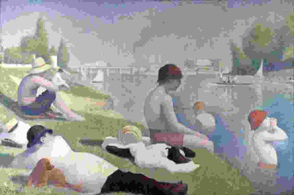 Georges Seurat in Une Baignade, Asnières: Jonathan Crary considers this cherished painting still to adhere to notions of the central perspective, illuminating the fact that Seurat’s illumination is not mine, in that I don’t care about central perspective at all. Evoke the Gilles by Antoine Watteau and maybe you can talk about displacements, connected with vaporous hot weather, colors — I say vaporous, where Jonathan Crary speaks of a disrupted harmony created mathematically, or by a refraction of sound, light, and trouble.