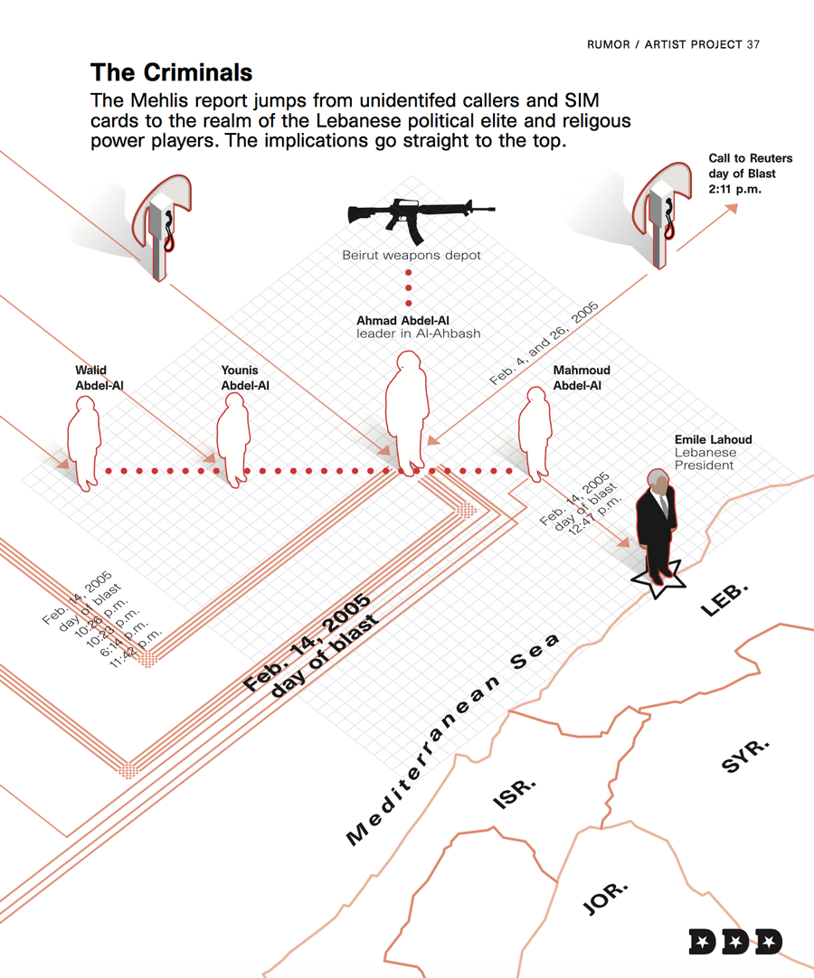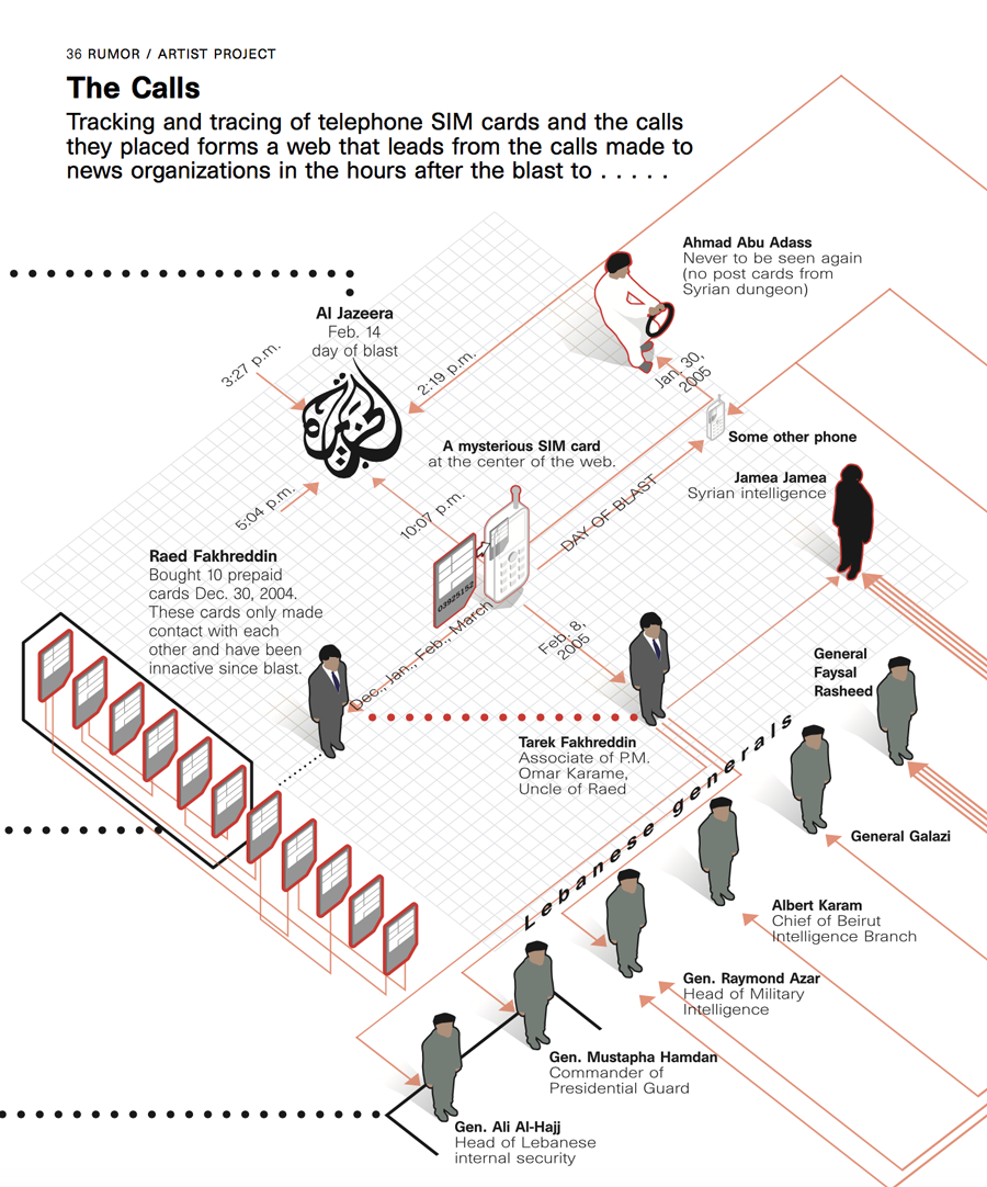 On the eve of the Lebanese government consenting to send the assassination to an international tribunal for further investigation, the editors and the artist referenced above commissioned a graphic designer from a major mainstream international newspaper to engage with the Mehlis report, to take on its presentation of time and place — with a focus on the chapter relating to the use of prepaid telephone calls made in the days and hours before the assassination (pages 57–58; sections 199–203). In the end, the SIM card, and prepaid phone cards generally, become the basis for linking almost every single one of the suspected players. Some links are direct, others are once-removed; and yet others are twice-removed. What is perhaps remarkable is the coincidence of all these individuals being linked to, for example, the prepaid card identified as 03925152 (section 200; page 58). In accepting this task, the designer was recreating the very act that takes place in newsrooms across the world, every day: that of reducing a complex set of facts and relationships into a consumable graphic form. We assume that the relationships charted here also formed the basis on which some players were ultimately arrested.