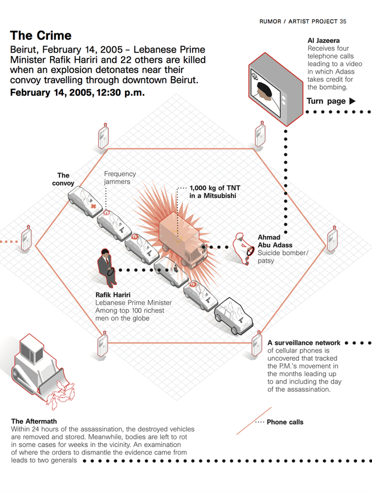 In which the editors collaborate with an artist to commission a newsroom graphic designer to visually render the report of the International Independent Investigation Commission Established Pursuant to Security Council Resolution 1595 (otherwise known as the Mehlis report).