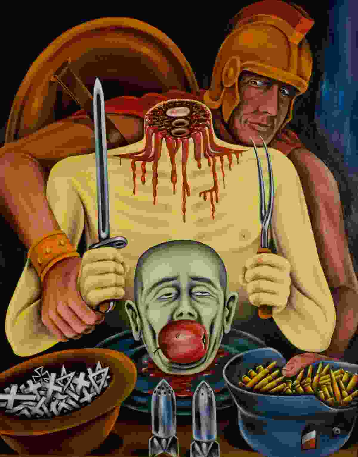 A greenish head sits on a dinner plate, a red apple in its mouth. A man’s headless torso holds a knife and fork at the ready, eager to consume his severed head. Also on the table are a pair of missile-shaped salt and pepper shakers, along with an overturned helmet that brims with metal crosses and Jewish stars. Peering excitedly over the cadaverous diner’s shoulder is the god Mars, dressed anything is in its turn the cause of a new beginning. And from this for battle in a cape and a golden shield. He too looks a lot like the young Jack Kevorkian.