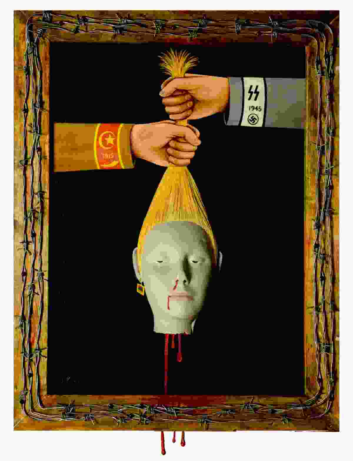 Quite at home in the museum, the severed head of a young woman dangles by her hair a few feet from the reception desk. Two hands are holding her aloft: one bears a cuff with an Ottoman crescent and the date “1915,” the other a Nazi swastika and “1945.” Kevorkian’s own blood drips from the head and spills onto the painting’s frame, which is ringed by barbed wire. In my pamphlet I read a section on “Lessons of Genocide,” and it’s as if it were written as an exegesis of the painting itself: “German military leaders were present in Turkey and saw the extermination of the Armenians take place without interceding. Hitler referred to the Armenian Genocide and said, ‘After all, who today remembers the Armenians?’ One could cynically conclude that Hitler was the only western governmental leader to learn a lesson from the Armenian Genocide.” Kevorkian in turn had titled the painting 1915 Genocide 1945, and on a plaque that hangs nearby writes of the need to commemorate the two catastrophes: “To fail to take but token interest in the whole ugly affair, to avoid making it almost hereditary memory, would be abdicating decent human responsibility and thereby assuring recurrence is happening at this very moment.”