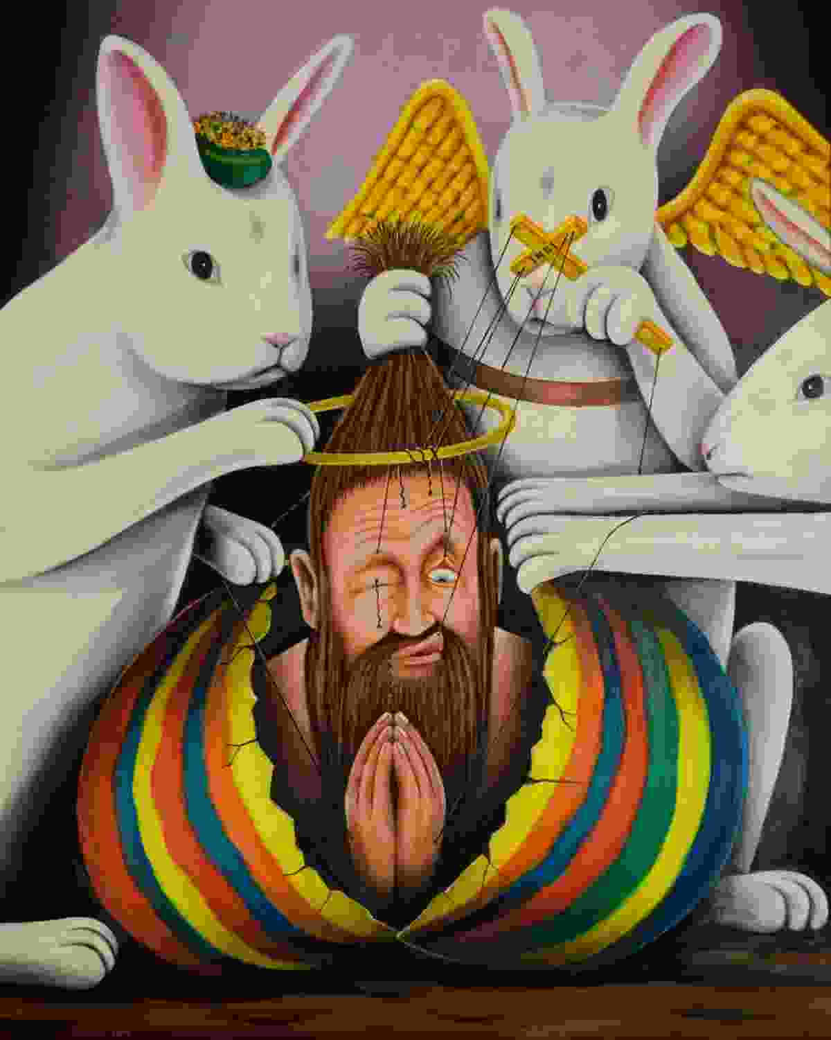 A man in a coma lies on his back, with his bare, wrinkly feet sticking out of the bedcovers as he slides head first into the dark, gaping mouth of a blindingly white skeleton. On another canvas, a man reduced to raw sinews and bones is engulfed by flames, his eyes turned heavenward like Jesus on the cross. In a third, a kneeling man has had his brain and his spinal chord removed; they hang suspended by chains near him. Half his body has turned to limestone: his healthy right hand holds his shattered, dismembered left. His face — like the viewer’s — wears a shocked grimace.