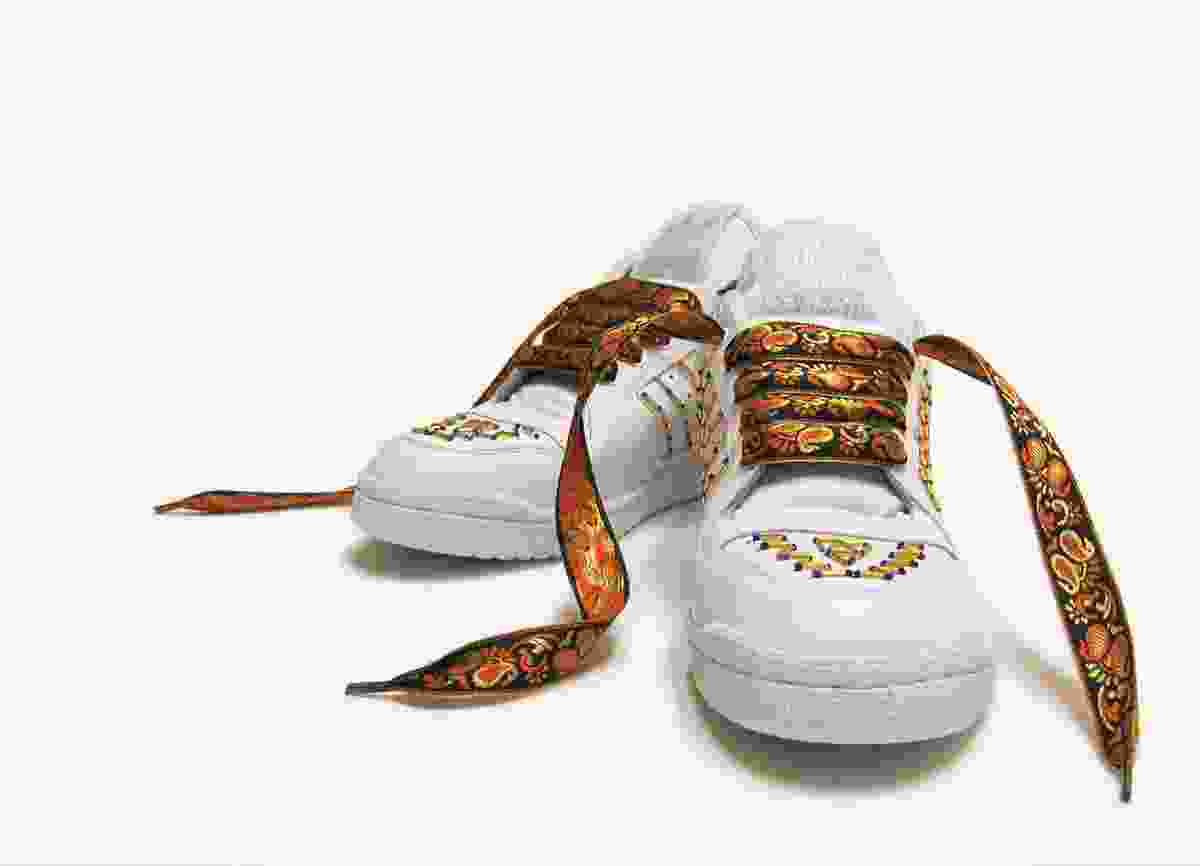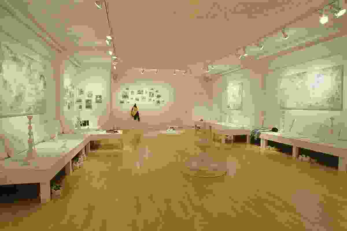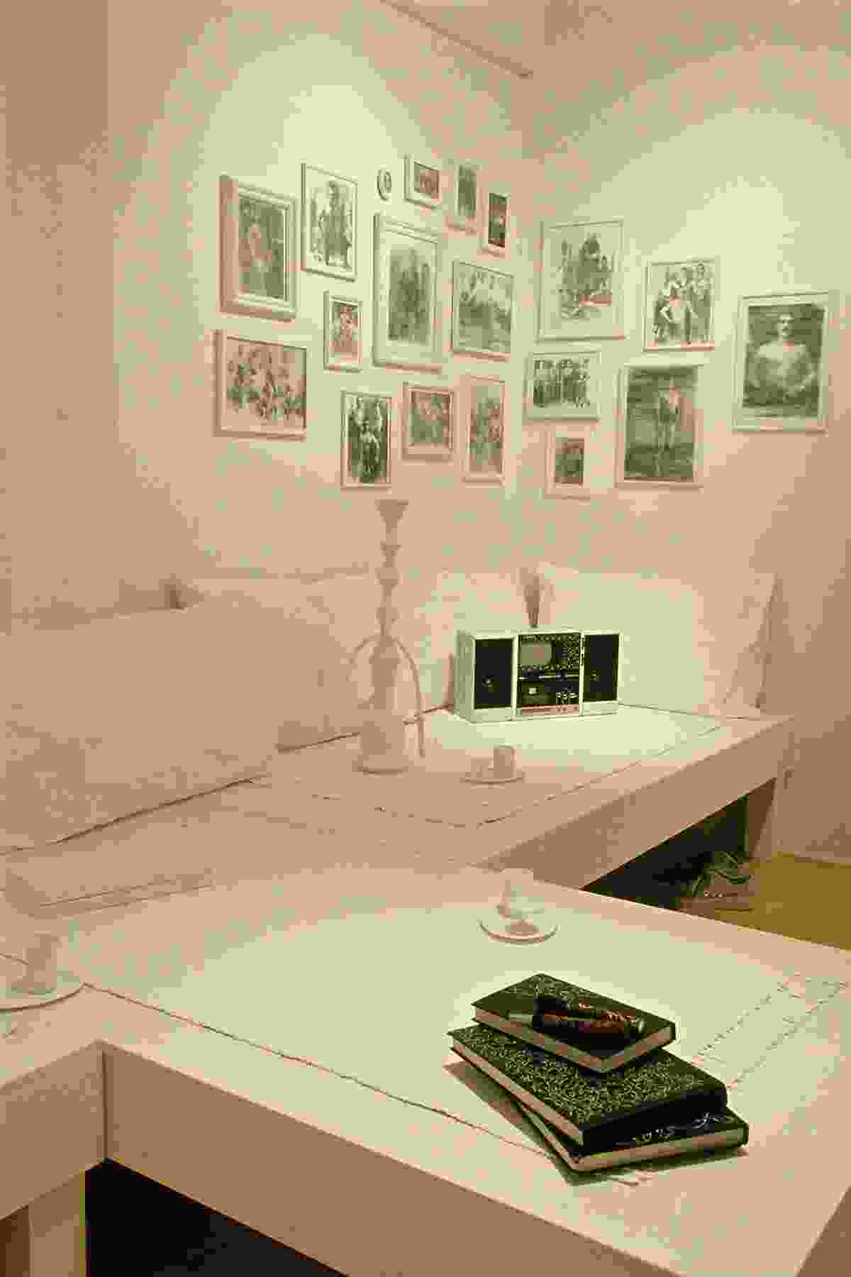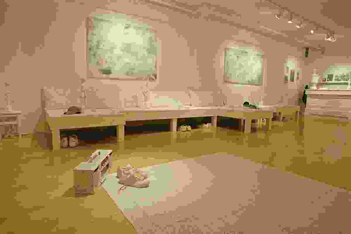 But while he is inspired by the Tehran coffeehouse scene, Ebtekar is troubled that much of its colorful vitality seems to be draining away. “There’s only one place you can hear naghali in Tehran, at Azari coffeehouse,” he says. “It’s also one of the only coffeehouses that still has photos of strongmen on the walls.” So when he was offered a solo show at San Francisco’s Intersection for the Arts, Ebtekar knew just what he wanted to do with the platform he’d been given: To turn the gallery space into a traditional coffeehouse interior that doubles as a hiphop hangout, where East could meet West and the next generation could pay respects to generations past. The result was Elemental, a coffeehouse interior with its traditional furnishings eerily whitewashed. But while the sardam platform seating, hookahs, and mythological paintings seem to be fading before our very eyes, a tenacious Persian floral motif appears to be taking root on turntables, across a linoleum breakdancing floor, and onto track suits and Adidas sneakers. Here Ebtekar seems to be throwing down a challenge to his audience to make traditional culture their own, and wear it with pride.