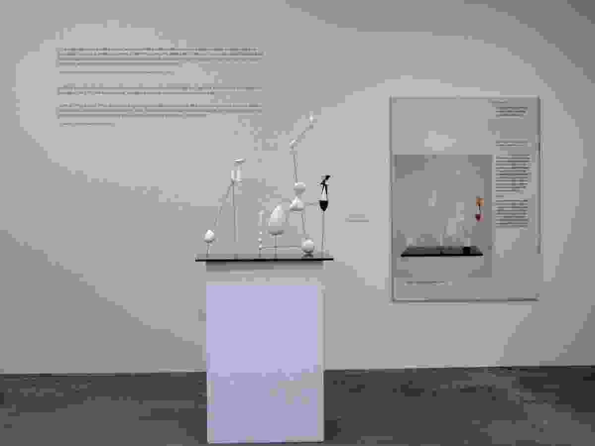 The work, Didactic Panel and Model of Alexander Calder’s Vertical Constellation with Bomb, 1943, recreates a delicate Calder sculpture composed of irregular and abstract shapes linked by steel wire. A large accompanying wall text, cheekily deemed “didactic,” playfully relabels the elements of the original sculpture— connecting the Shah of Iran to Churchill to Truman to Roosevelt, and so on, as manifest in the sale of Iranian oil to America, the development of hydrocarbons in Venezuela, and even the Manhattan Project. Lo and behold, history is full of accidents. Calder, we also glean from the panel, once said about his open constellations that they “had a suggestion of some kind of cosmic nuclear gases.”