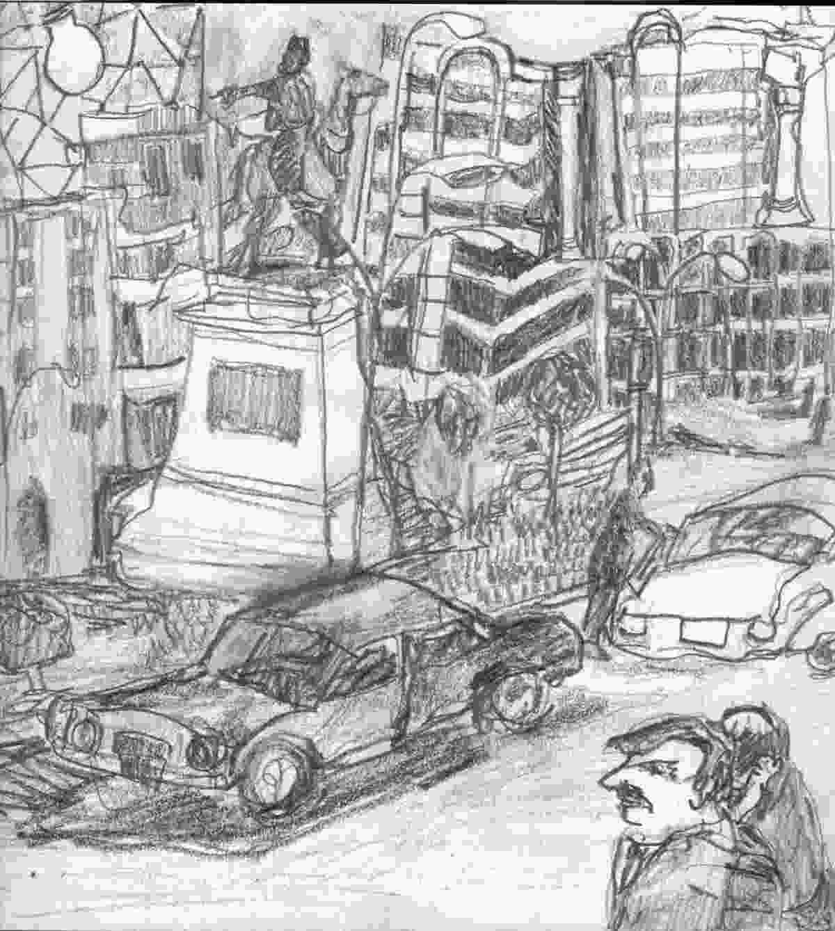 RS: This multiplicity, of layers and confusion, is very present in your art, especially in your drawings. So many of your works look down into the vortex of the city, where things are moving and churning, like rushing water churning around a drain.