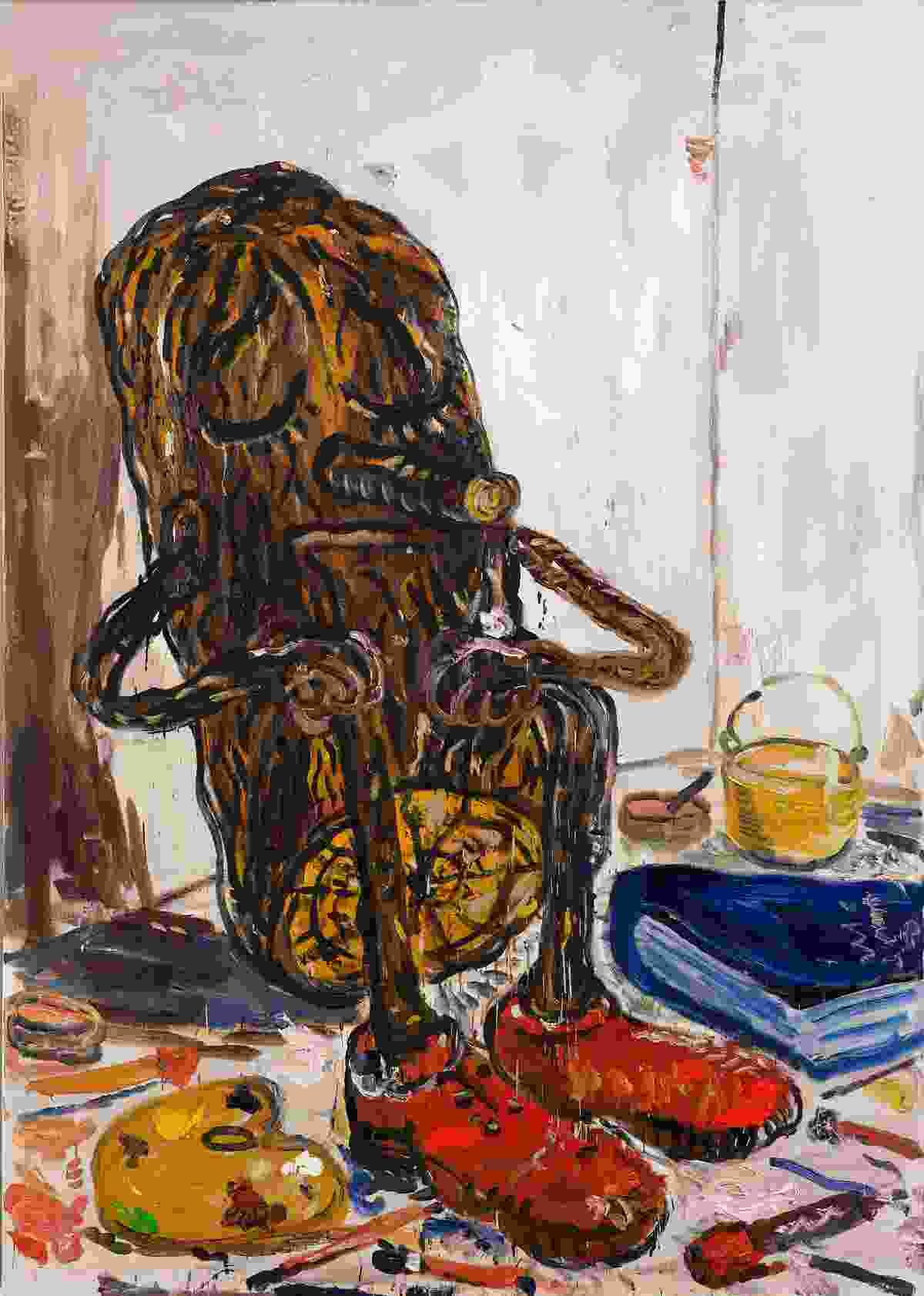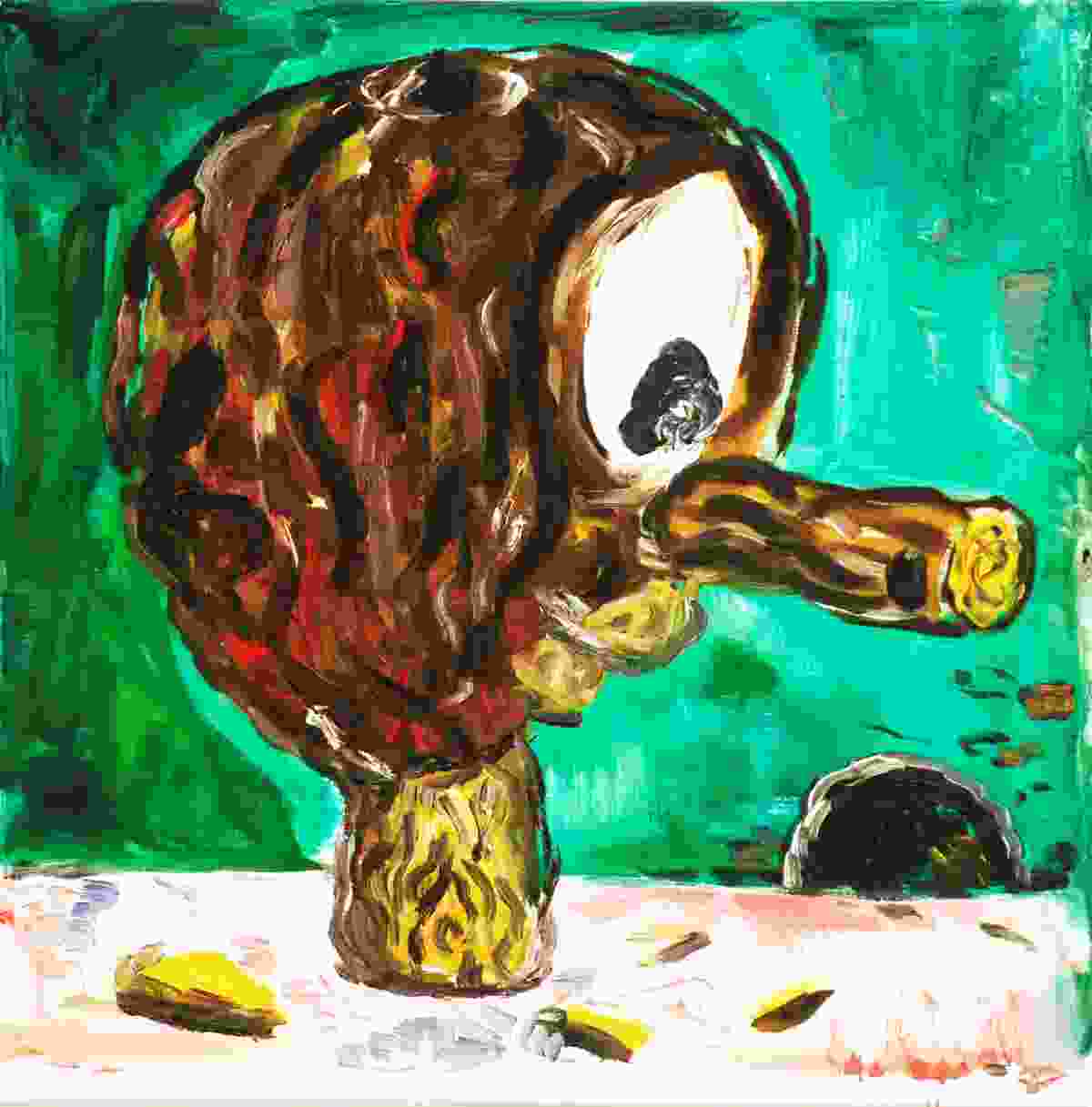 Very often, it is very difficult not to laugh. Take Untitled (Painter) from 2009, which depicts the artist as a piece of wood — or rather, Pinocchio. Here, the anthropomorphic stump wears great big red shoes while a cigarette dangles from his mouth. He appears to be dozing against the wall, slumped over in exhaustion. Everywhere around him is the stuff of painting, scattered like the contents of a fallen purse — brushes, palette, paint. One can’t help but summon up a scene from a bad French movie about stunted genius. Still, it is difficult not to empathize with the familiar pathos; like Pinocchio, who dreamt of becoming a real-flesh boy, this artist dreams big. Or take Untitled (Potato), a work starring a crazed young spud — his tongue hangs from his mouth and his eyes are googly — who seems to have, in some variation of van Gogh, chopped off his own right arm. The work isn’t exactly cheerful, but its weird humor is what saves it from the unsightly realm of self-indulgent navel-gazing.