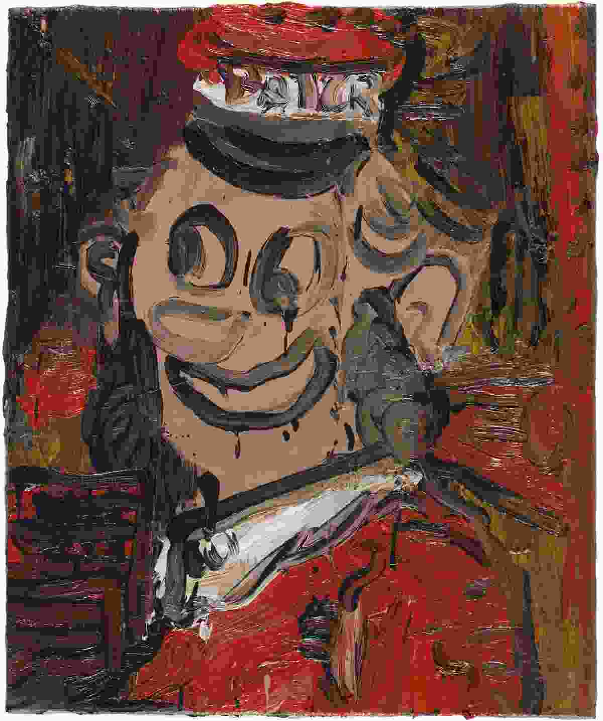 Painting does work for him. The forty-three-year-old paints mostly large-scale, mostly absurdly dramatic canvases in lush primary tones. His images are drawn from a dense, cartoon-inflected universe. Yet something about them is always off. The noses are too big, the chins are missing, the fingers droop. Figures, drawn in broad painterly strokes, seem deranged, over or undersexed, melancholic, alcoholic. There is a nameless anxiety throughout.