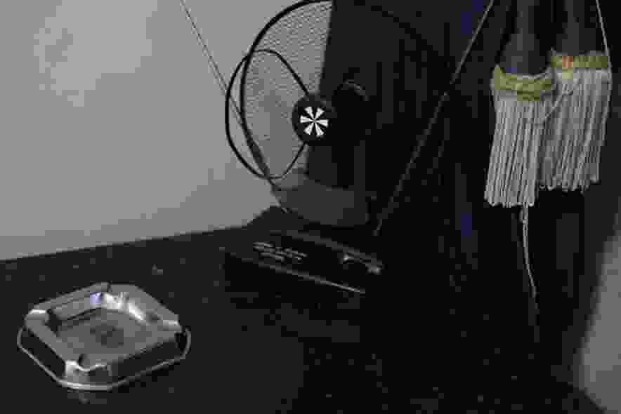 fan, a carpet, a table, and a television. The furnishings of the rooms resemble those of nearly every Lebanese grandfather’s house, a place where one can recall memories too large to be held in its four walls, a place where one can find the kind of peace in which to sit at ease, surrendering oneself to a private past within a public space — a strange feeling that induces a smile of complicity.