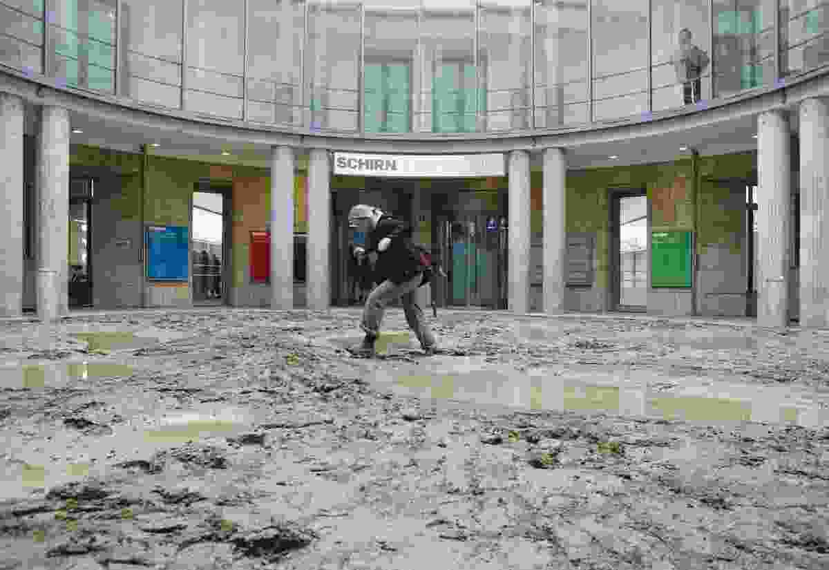The Rotunda’s floor is usually paved with concentric circles of neatly laid cobblestones. But for Erkmen’s project, entitled durchnässt (soaked), the cobblestones have been unearthed and replaced with earth, heaping great bucketfuls of dirt, mixed with water to create a sloppy, muddy passage. Irregularly placed islands of dirt seem to float among the filthy puddles and offer themselves up as stepping stones through this dismal wasteland. Where once people could confidently stride through, now they must tread carefully, walking around or picking their way through, and are thus forced to notice and pay more attention an area that might otherwise have been overlooked. The contrast between the Schirn’s clean, pure facade and this swamp is striking, as though a farm yard were transported into the center of this gleaming metropolis, home of the European Central Bank and high finance. It is somehow uncomfortable, perhaps like mud-soaked boots on a society hostess’ white sofa.