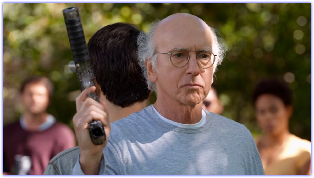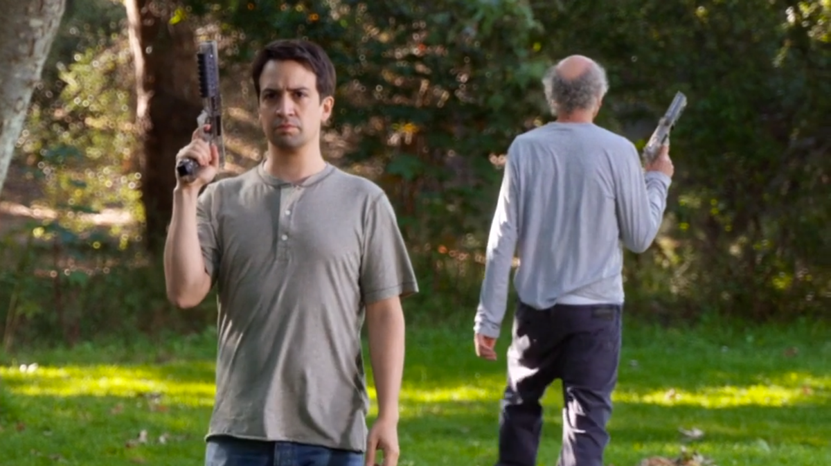 That was then. This season, near the end of the final episode, Curb restages a bit from Hamilton — Alexander Hamilton’s famous duel, this time fought with paintball guns. Lin-Manuel is cast in the title role, while Larry stands in for Aaron Burr. It does not end well for either man, but Lin-Manuel gets the worst of it, a paintball to throat. Larry swears it was an accident, but as the mufti might say: what choice did he have?