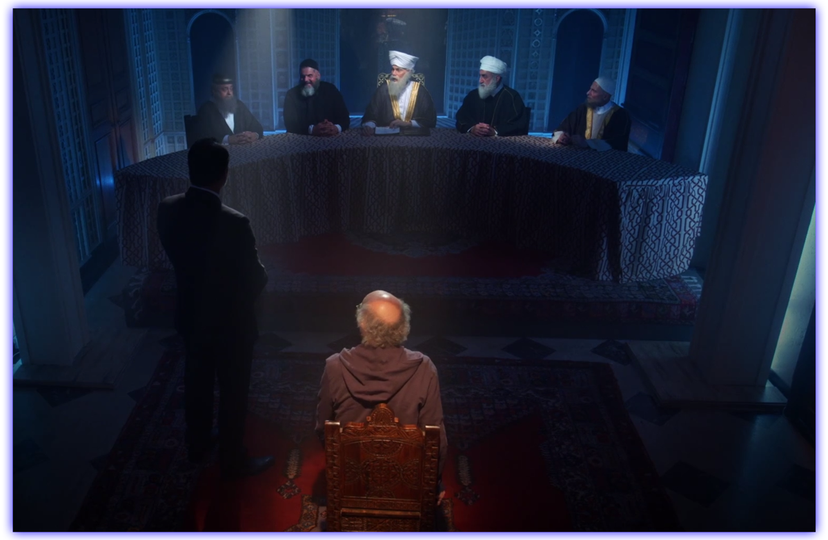 The Cutting Man presents the case for the defense to a council of lunching mufti, who come to see in Larry a kindred spirit. And why shouldn’t they? Like Larry, the empaneled are aging judges, their performances pitched in the rough vicinity of the Moses scene from Mel Brooks’s The History of the World Part 1. They all find the present confusing and annoying in equal measure; everyone hates it when someone hogs the ketchup. “What choice did he have?” one of them exclaims after the Cutting Man makes a particular case. Larry will be allowed to live, the fatwa lifted with two episodes to go.