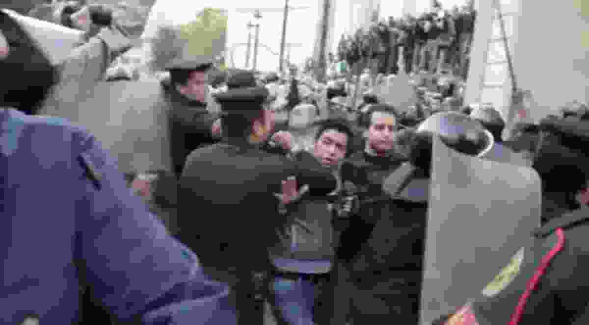 Protesting journalists fan out and roost on a ledge, like a nest of baby swallows. In the street, it comes to blows between the boys of the public and the boys of the police.