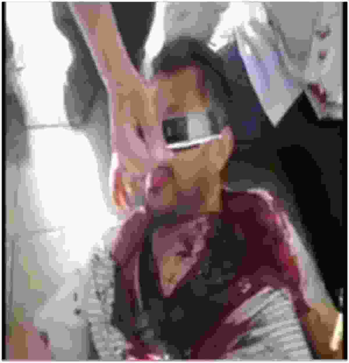 A Vlogger details his wounds from the revolution. Large stitches hold his inner thigh together. Yellow and purple swirl around the edges, a vivid slashed bruise. A river pastoral hangs over his head, green fields with white water.