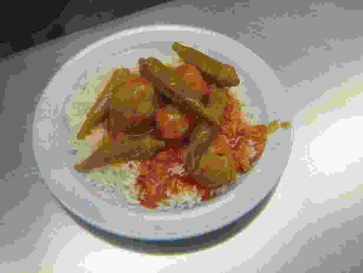 Serve with a side of yellow rice and Amba (pickled, curried mango.)