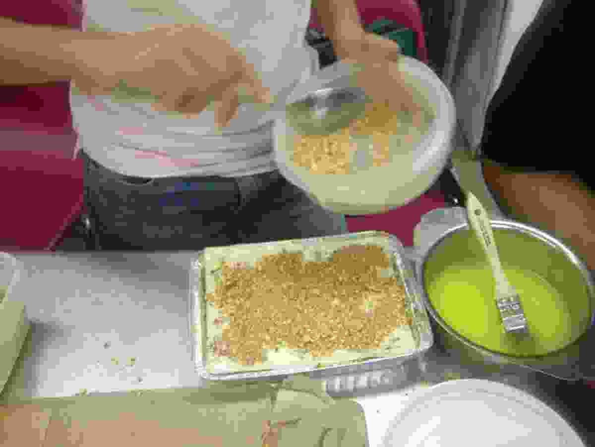 Brush the bottom of a lasagna pan with the melted butter. Open the kataifi dough, and divide into 5 parts, approximately 6 inches long each. Take one part, loosen the dough and fluff. Spread on the bottom of the pan. Sprinkle the nut mixture on top of the kataifi dough. Then, carefully roll the dough so that the kataifi represents a “log” with the nuts inside. Repeat this step for the other five sections. Pour butter with a spoon evenly over the pastries. Cut into pieces (like maki) if desired. Preheat oven at 375˚F and bake for 35 minutes until the dough is golden brown. Let the pastry cool for 10 minutes. Slowly pour syrup over the kataifi, letting it soak in before pouring more.