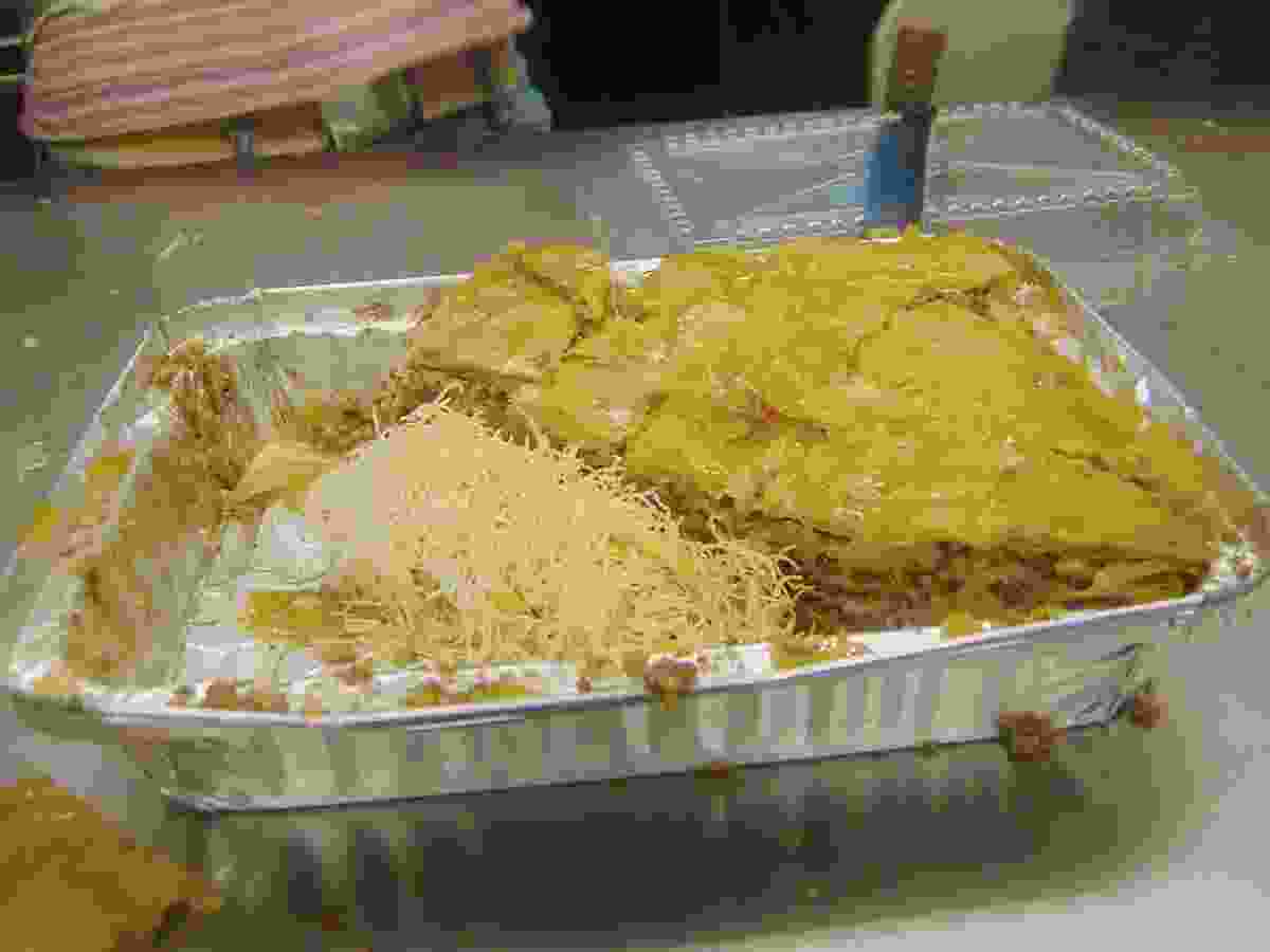 4. Preheat the oven to 300°F. Score the top of the sheets in order to divide the baklawa in the shape of your preference (squares, triangles, etc). Bake for 1 hour or until top is golden brown.