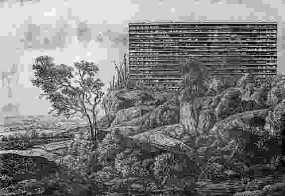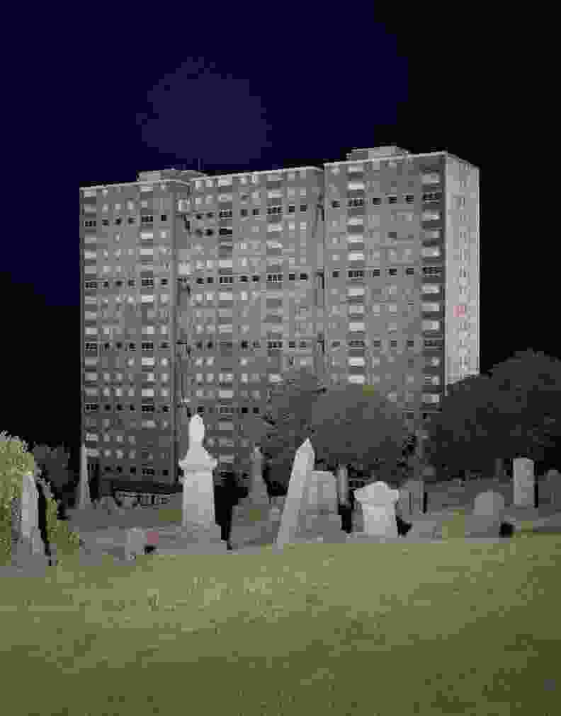 Dunepark might be thought of as a cousin to Gaillard’s recent Cenotaph to 12 Riverford Road, Pollokshaws, Glasgow (2008) — an obelisk cast from the remains of a Glaswegian modernist social housing project, demolished in advance of the city’s hosting of the 2014 Commonwealth Games. Placed within a wasteland-like “secret garden” in Hubert Bennett’s iconic brutalist Queen Elizabeth Hall (1967), London, the work, unlike Cleopatra’s Needle directly across the Thames, is half-hidden from the public, visible only through the internal windows of the concert hall’s foyer, or on an organized tour. Not a display of colonialist spoils, then, but rather something close to a resurrection or reincarnation. The word “cenotaph” betokens a monument to someone or something whose remains are elsewhere, and at first reading this seems an inappropriate designation for this obelisk — it is formed, after all, from the leavings of the building it memorializes. Perhaps, though, what is being remembered here is not the physical stuff of concrete, brick, and glass, but rather a devalued history, and a devalued dream. The fortress walls of the Queen Elizabeth Hall afford Cenotaph a level of protection uncommon to works of public sculpture. One chapter in the history of modernist architecture enfolds another, and a second, half-secret life is eked out. Looking through the windows of the concert hall’s foyer, the casual visitor might imagine that Gaillard’s obelisk (with its trans-historical form) has stood in that space since long before the building’s birth.