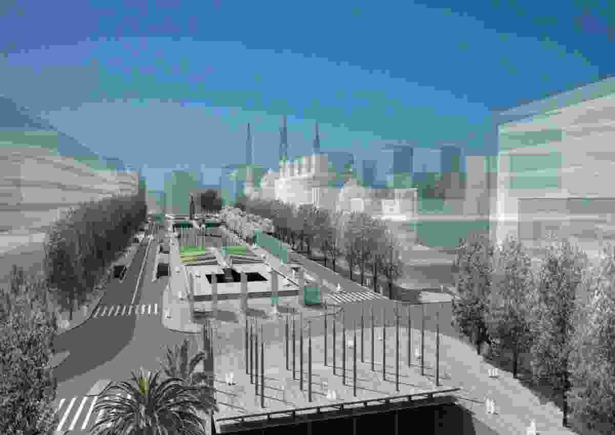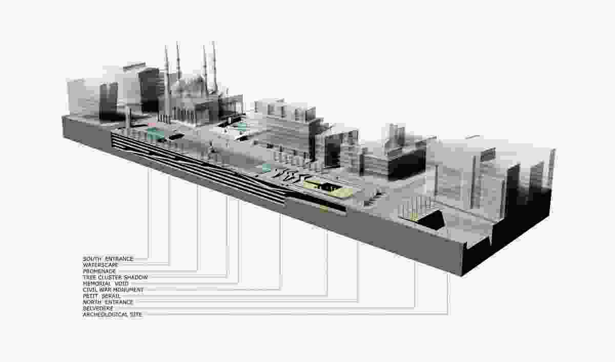 We considered the city a palimpsest on which historical layers are engraved. So in the case of a spatial intervention, these layers needed to be read and reinterpreted. Our main concept for the competition has been the revealing of historical layers that compose this space. We’ve introduced the idea of a “fissure” on the city surface that tears the earth into two fragments only in order to reunify it. This fissure is constantly transformed while the axis evolves, creating a continuous route towards the sea — organizing urban space in a sequence of “episodes.” Four “topoi” define the axis: The “threshold” symbolizes present time and is about intensity, rhythm, contemporary city life, communication, information. The “memorial void” represents the recent past and is about reflection and pause, but also tension and protest. The “trench” represents history and is about tranquility and a common past. The “gateway to the sea” symbolizes the remote past and is about reverie, recreation, and journey. These distinct places play different roles in the narrative of the entire area.