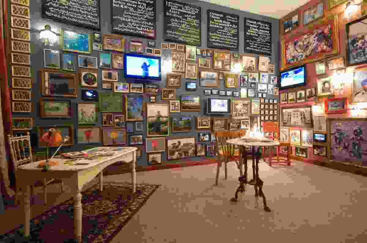 Elkoussy’s On Red Nails, Palm Trees and Other Icons — Al-Archief (Take 2) (2009), was a rich homage to Cairo and its collective memory. Assembled from hundreds of the artist’s photographs and found images arranged in an intimate room, the freestanding construction came complete with chairs and a carpet, dimly lit by a chandelier. Portraits of young boys in uniforms, snapshots, photos of buildings and flora and fauna, video of daily life in Cairo, and much more was all hung salon style, ostensibly in the manner of many Cairene living rooms. The work presented a distinct locality through a fastidiously recreated visual history. Jabri’s sketchbooks, drawings, and collages, on the other hand, represented a history rediscovered. Part of a collection dating back to when Jabri first moved to Cairo in 1977, the playful, intimate, and even romantic work was uncovered after his death in 2002.