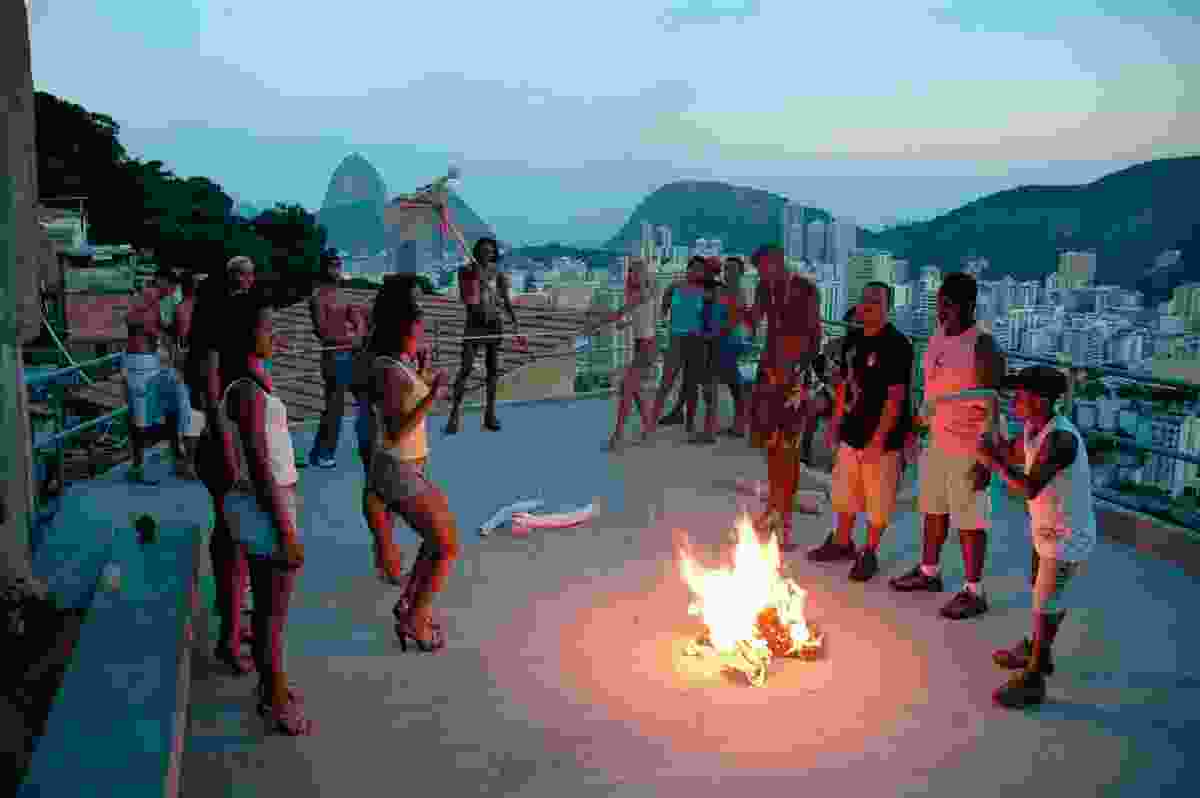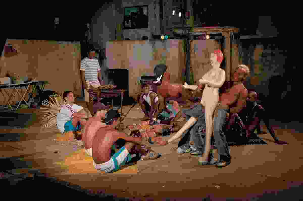 Through another passageway, a video projection — what the fuck is going on here? (Dias & Riedweg, “Funk Staden,” 2007) Big, sexy sausages on the grill, booty dancing, a circular array of camcorders atop a wooden rod spinning around by a bonfire, sixteenth-century colonialist illustrations of encounters with “wild cannibals” in Brazil, two sweaty guys humping a blow-up doll, funk music…