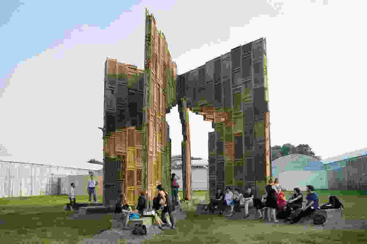 While walking through the exhibition, my high hopes shifted into mixed reactions: dissatisfaction flipping into infatuation; awe that quickly wore thin and then ballooned into tears; and, in the aftermath, heated arguments about why it’s “good” that the fantasy of building a Crystal Palace to house the curatorial paradigm of the twenty-first century ended up as such an ostentatious aberration. Yes, I even thought the screwed-up engineering that allowed this summer’s climate-change torrential storms to seep water into the Aue-Pavillon added to an aesthetic of disarticulation. And when Ai Weiwei’s neo-imperial “Template,” a twelve-meter-high temple of wooden windows and doors salvaged from “all over China,” was knocked down by strong winds, even better. What, you might ask, could possibly be so interesting about one of the most important international art exhibitions in the former West becoming such a mess?