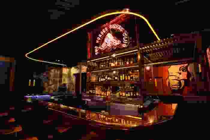 Open for just six months, The Double Club comprises three rooms: a bar in a spacious covered courtyard, a small nightclub with a revolving stage, and a cozy restaurant in which designer tables share space with molded plastic furniture. Built from imported wood and corrugated iron, the Congolese bar is modelled on Franco’s in Kinshasa and sits back-to-back with a polished-copper pub, above which a pink neon sign announces the “Two Horses Riders Club.” The nightclub section can be glimpsed through a two-way mirror surrounded by an azulejo mural of Russian architect Georgi Krutikov’s 1928 drawings for flying cities (a work that Höller previously quoted in a piece shown at the 2002 São Paulo Biennial). In the club itself, an LED-illuminated palm tree refers to Chez Ntemba, a popular Kinshasa nightclub. One half of the menu, in the meantime, is braised beef and terrines, the other kossa kossa (spiced shrimp), fumbwa (salted fish, peanuts, and yam leaves), and pig trotters. Höller plays curator, too, selectingğalong with Germano Celantğa curious range of works by Andy Warhol, Carla Accardi, and others, alongside Congolese artists Chéri Samba and the Kinshasa- based Monsengwo Kejwamfi.