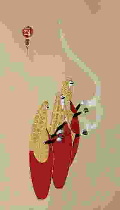 Refreshingly, Ghadah Alkandari sidestepped much of this prickly terrain in her quirky line drawings and colorful paintings, which featured a cast of dour-faced women, each sporting an austere bob. Writ large in Kahraman’s paintings, women’s oppression was more insidious in Alkandari’s drawings, hidden in quiet hysteria. Sometimes accompanied by text, each drawing was a vignette from the humdrum life of a housewife. An oppressive, almost palpable, ennui pervaded these scenes, which seemed stuck in the interminable moment before something happens: before the door is answered, in The Door I-III (all 2007), or before a rival is struck, in The Slap (2007). In Feeling Pretty (2007), the never-ending quest for beauty was a fraught balancing act, the protagonist teetering on one big toe atop a slender Vimto bottle. The Rehab (2007) showed a quartet of women with shopping bags, the title suggesting that shopping might be both cure for and symptom of their ills. Read against the backdrop of Dubai’s fashion-crazy mall culture, Alkandari’s wry drawings seemed to question the emancipatory claims of the modern Gulf woman.