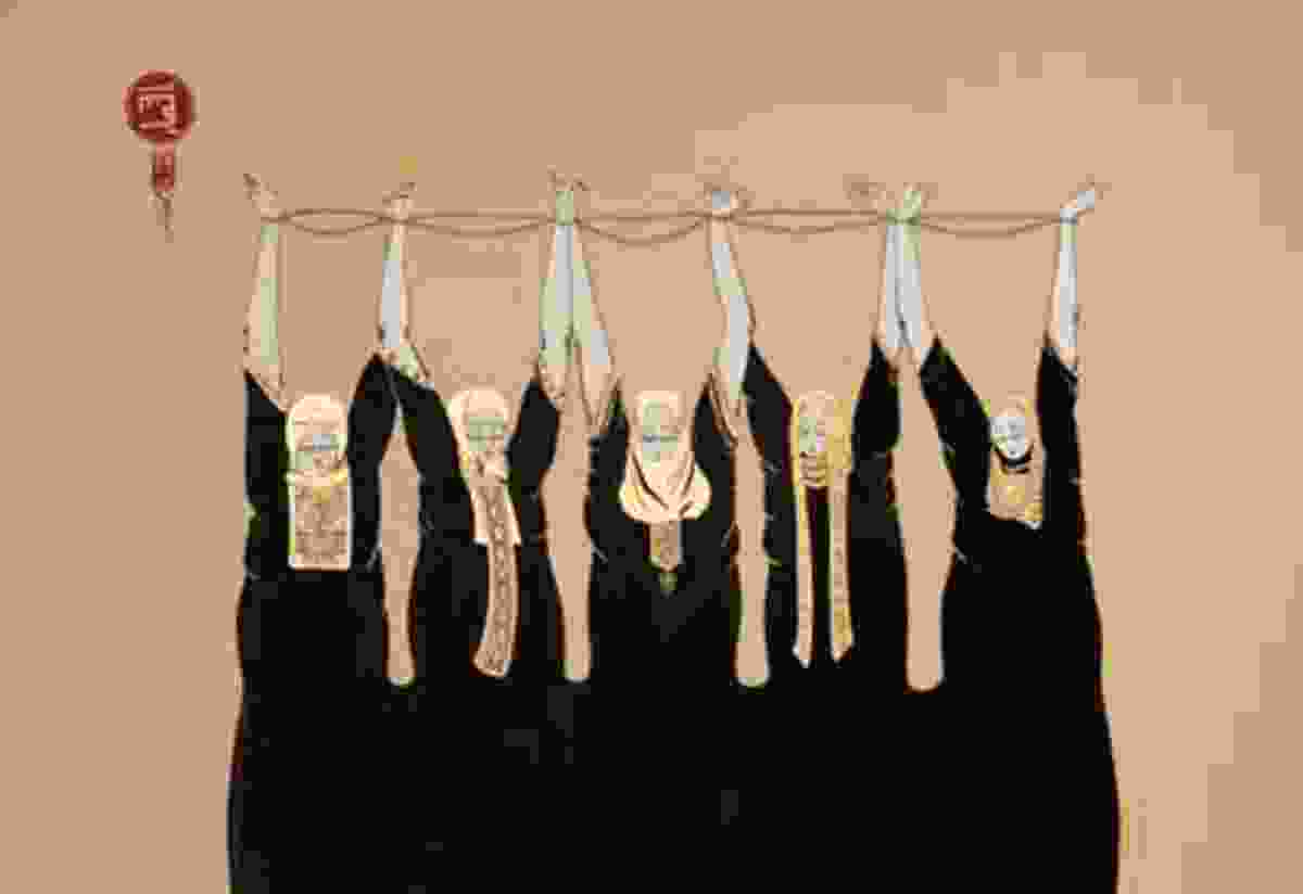 Hayv Kahraman’s precious Matrioshka (2007) sculptures provided a more humorous take on the veil, adapting the traditional Russian nested doll for the Middle East. Smooth, shiny, and black, the outermost doll was a burqa-covered woman with a golden grille, at eye level. With each nested doll, the underlying figure was gradually exposed, finally revealing a golden-haired woman in an off-the-shoulder dress. Accompanying the sculptures was a (somewhat overwhelming) selection of Kahraman’s trademark sumi-ink paintings, some augmented by acrylic and watercolor, which drew from Japanese and Chinese art, Persian miniatures, and the melancholic yet exuberant art nouveau illustrations of Aubrey Beardsley, to explore diverse subject matter to varying effect. Many addressed the oppression of women in the Middle East, especially under war conditions, as in Kahraman’s native Iraq. Trains of captive women appeared in Kurdish Women Dancing (2006), Chained Women (2006), and In Line (2007), where the bodies were largely reduced to irregular, oblong forms, mimicking the dolls. In Honor Killings (2006), repeated sets of minimal forms depicted a dozen veiled women dangling by their necks from the branches of a barren tree. Strangely auto-Orientalizing, the skillful execution and formal elegance of these works seemed to grate against the ideological weight of their subject matter.