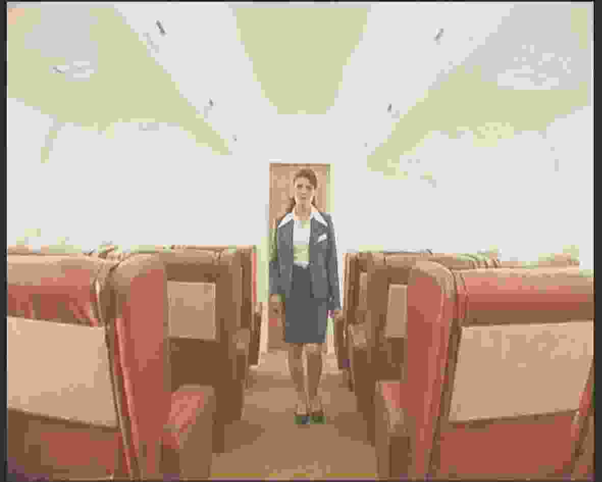 The action that unfolds is pretty simple. In the first half a group of young hostess trainees engage in a series of exercises and games in the headquarters of a fictional airline — during which they subtly compete against one another. Cut to a few months later in mid-flight (or are they two separate journeys intercut together?) and we’re with Farah and Lela, air hostesses and erstwhile competitors, colleagues and friends. On the flight they meet the enigmatic (and freaky looking) Count and his sleazily suave business manager, Mustafa. The film ends three minutes before landing, with Lela practicing her smile in front of the mirror. And that’s it. No narrative arcs, plots, complications or resolutions, no cathartic sacrifices and judgements, but rather an engaged and engaging suspension.