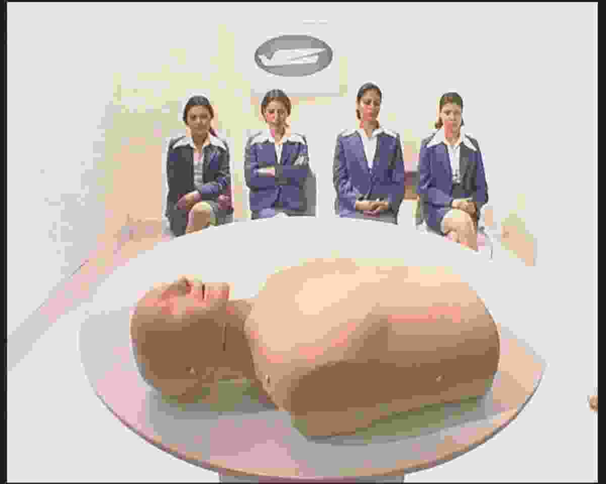 El Azma’s unforced pace, the casual manner in which he manages to construct (art direction, lighting, camera angles and movement) his images as a repository of depth, is part of an approach in which meaning is sensed and discovered rather than declared. In an especially poignant scene, Mustafa dons a sleeping mask and proceeds to flirt with one of the women. In another the hostesses in training practice mouth-to-mouth resuscitation on a male dummy. Uncomfortable and ambiguous, these images speak of a location that is beyond their mere concrete manifestation — gestures towards an invisible eye, toward what we can sense but not explain.