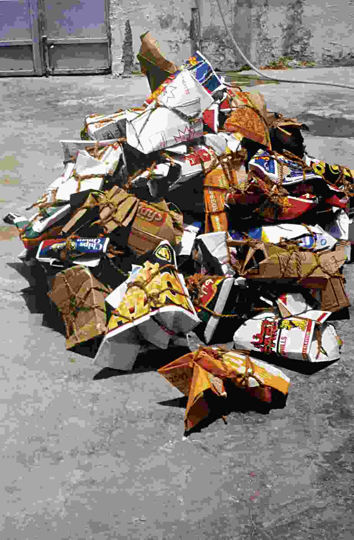 Continually in progress, his current work revisits packaging materials that he collected from the streets but he now focuses on the brand names. Recent installations are a study of the relationships between commodity and community; these brands, as they go in and out of shops and houses, form a universal connection in UAE society.