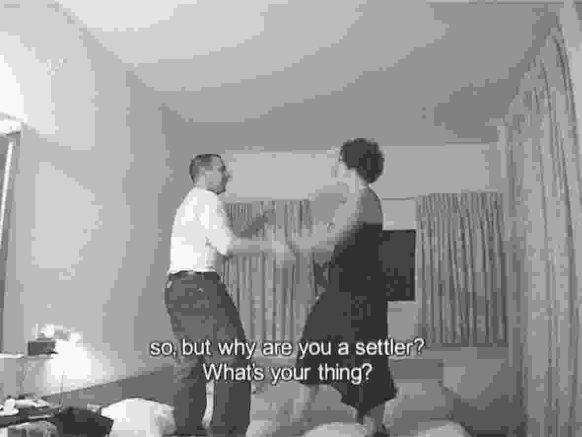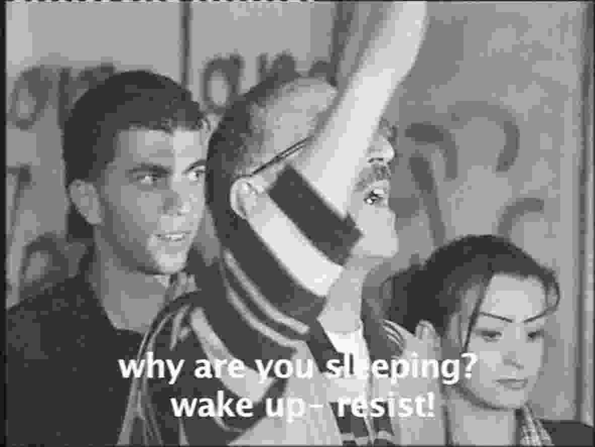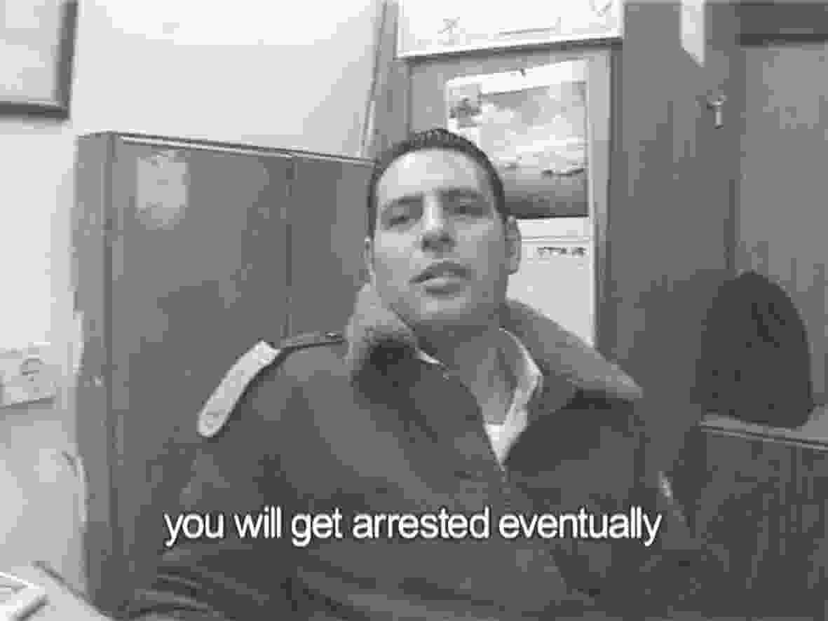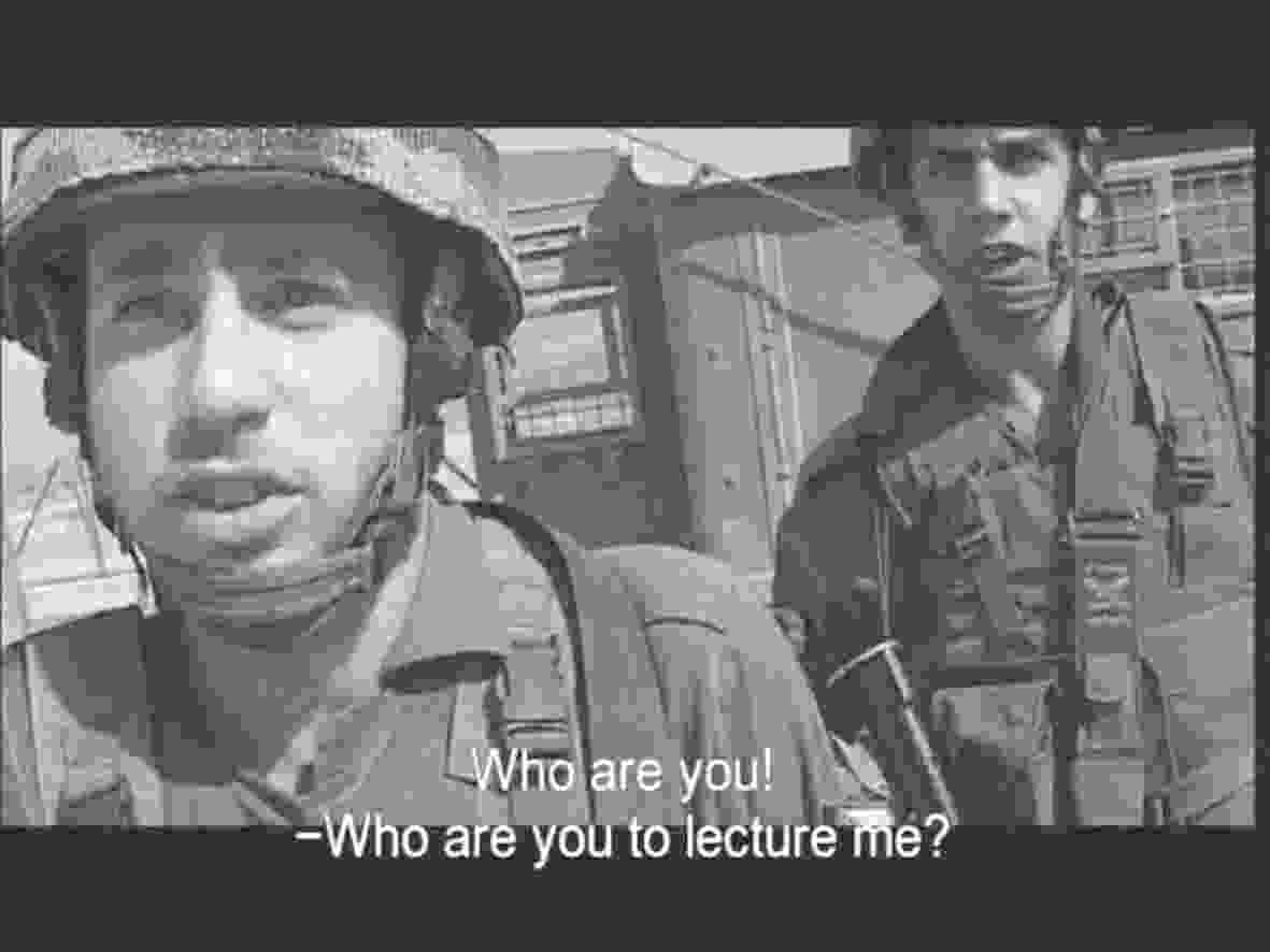 BS: In the selection, Avi Mograbi violently resists the authorities: his work Details 3 and 4 views two corresponding scenes filmed in the Occupied Territories. The first one documents soldiers attacking him, while in the second, he attacks them. Annan Tzukerman subtly depicts his attempts to be embraced by a settlement community. What is the social and psychological significance of these works in terms of mobilizing fear?