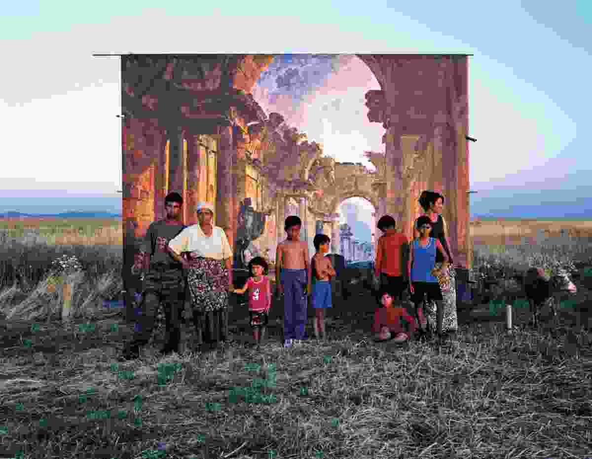 Finally, Danica Dakic’s (Sarajevo/Dusseldorf) cycle La Grande Galerie: Roma — Enclave Preoce, Kosovo (2004) consists of carefully composed photographs of local Roma characters in front of a mixed backdrop of landscapes and canonical paintings from the Louvre Museum, reminiscent of a famous work by Georges de La Tour. The irony of these beautiful prints is simple: The artist, who was once a refugee, is photographing people who have been vilified for supposedly collaborating with the Serbs in Kosovo, on behalf of the Kosovo Albanian ethnic population, which was itself repressed by the Serbian ethnic population in Kosovo, which in turn is ethnically linked to the Serbian ethnic population in Bosnia, which itself once repressed the Muslim Bosnian population, which happens to correspond to the artist’s background, and so on. Deeply theatrical in atmosphere, Dakic’s prints convey a sense of roles that are obviously changing.
