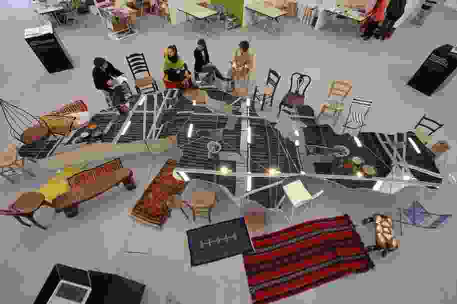 Italian artist Michelangelo Pistoletto takes a different approach. Where Durrell was fuzzy, Pistoletto is clear. For the installation Love Difference, part of Flight 405, the debut exhibition at Galerie Sfeir-Semler’s new outpost in Beirut, he reproduced the Mediterranean in miniature, building a mirror-topped, low-leveled conference table that reflects the exact shape of its craggy contours. A motley collection of some twenty chairs, pillows and carpets surrounds this table, each representing a country with a Mediterranean coast. In its cartographic accuracy, Pistoletto’s installation counters one myth about the Mediterranean being limited to a posh European preserve.
