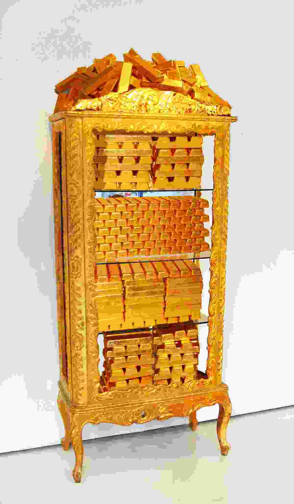 It is true — at times, the lines between fake and real in his work become impossibly blurred. When showing his gilded vitrine series at the Sharjah Biennial in 2005, for example, he pleased two passing sheikhs, who appeared visibly disinterested in the postmodern stuff of international biennialdom that surrounded them but who nodded admiringly at Moshiri’s glittering objects — finally, something they liked!