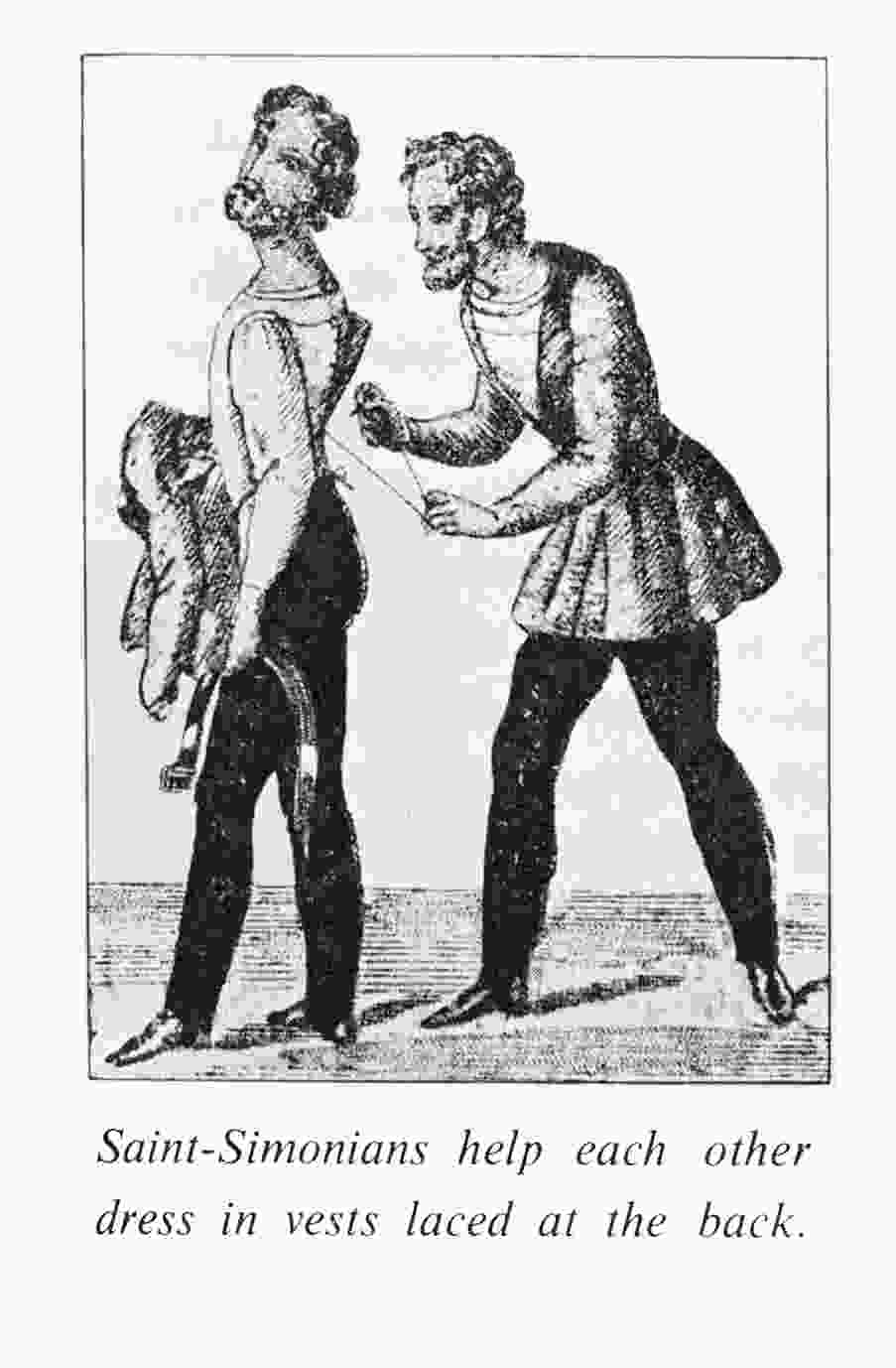 The Saint-Simonians would attract hundreds, if not thousands, of followers and spectators during their escapades. Prior to their trial, they had built a temple in their camp at Ménilmontant, what was then a suburban commune outside of Paris. There they would perform their rituals, complete with costumes, marches, chants, and feasts, before crowds of curious onlookers. They took to wearing collarless shirts, flowing red scarves, and long blue coats that buttoned on the back (to foster a sense of dependency on their brethren, in dressing as in other aspects of life). A beard was de rigeur.