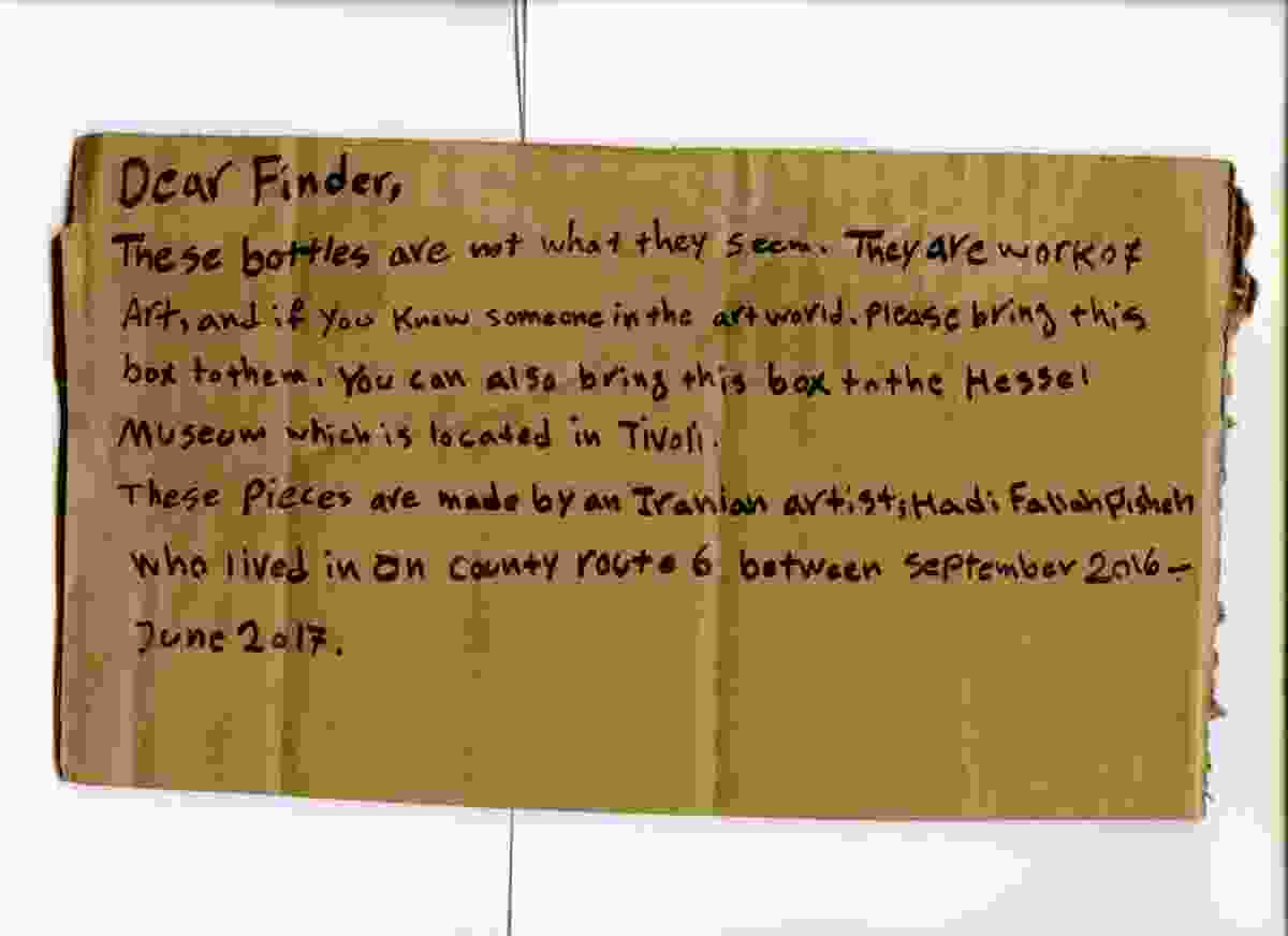Obviously, I was going a little crazy. But I did believe in the value of this experiment as an artwork, as a performance. I was going through pain, and I wanted to transfer that pain to an object. Someone said to me, “Hadi, you won’t be deported, but you might be killed or arrested or sent to Guantanamo.” That was helpful information. I adjusted my plan. I thought, Maybe I could light the Molotovs and throw them in the Hudson River? Then a new idea: How about if I bury each one with a letter? A little like a time capsule.