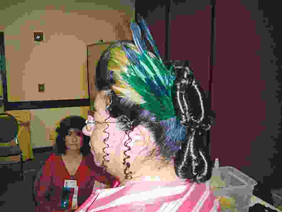 Mani: This must be just another in a long line of mistakes. Let’s just count the mistakes in this picture, shall we? 1. The color of that shirt that is showing way too much neck; 2. the weird pony tail thing; 3. the feathers; 4. the twirly things just hanging there… Can you imagine this persons furniture? Hey bitch, you’re on our planet now, just try to blend in before Ashcroft gets suspicious.