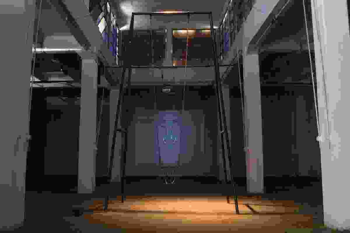The installation consisted of a rusted swing hanging five meters high in the center of the gallery. A spotlight pointed to its cage-like seat, creating an eerie shadow play. In the background, a looped video projection showed the swing swaying in solitude. Bathed in darkness, the huge construction appeared menacing and intimidating and was anything but a cheerful recollection of childhood. Though it was amplified