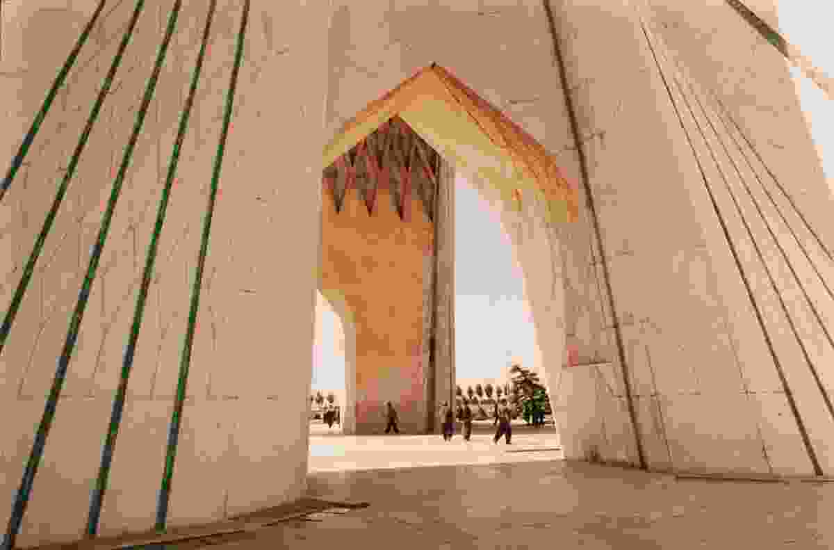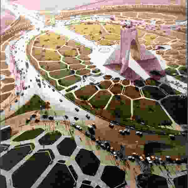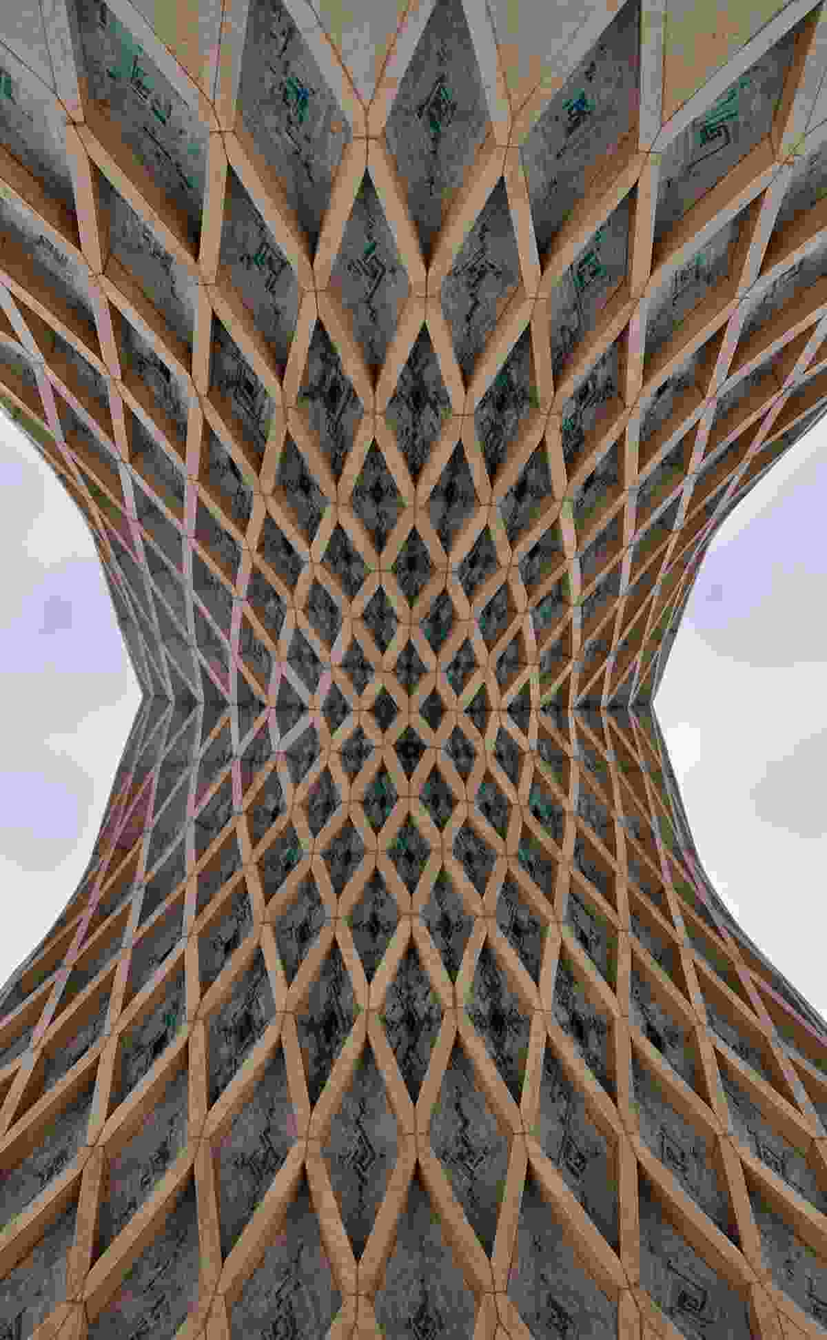 If you can picture only one building in Iran, it is probably Tehran’s Azadi Tower, a massive, white marble megalith, some fifty meters tall, set inside a landscaped island on the western side of the city, just a few miles from the airport. The Azadi (“Freedom”) Tower has become visually synonymous with its city — not unlike the Eiffel Tower, the Empire State Building, or even the Kremlin — a metonym for modern Tehran. Built in 1971 for the celebrations in honor of the 2,500-year anniversary of the Persian Empire, the structure was originally named the Shahyad — the king memorial. And indeed, its form seems fit for a king: its wide base tapers upward to a high arch, densely interwoven with lines of ribbing, which is itself the underside of the thick, beveled tower at the monument’s top. From different angles, the geometry can beguile: wide and squat from one side, tall and lean from another. The stone surfaces curve and flow like a ball gown, and its formal complexity suggests something at once deeply ancient and firmly modernist, a kind of trans-historical, citational mash-up.