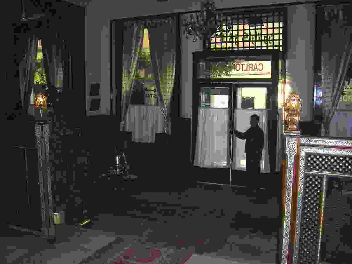 The Carlton's interiors are best characterized as a meeting of the Art Deco and the Orientalist. Rooms are large and have impeccably preserved furniture of the era. Downstairs in the wood-laden lobby, a very mini bar serves Stella beer and Egyptian wine. A respectable menu serves "negresco" (a fancy word for spaghetti) as well as myriad other variations on the theme of spaghetti, such as "the bolognaise." There are some local favorites, too. If you're lucky, the bartender may chat you up, or the Nigerian evangelist who has just arrived from Abidjan to spread his gospel to the willing. An exceptionally small Japanese man is also sitting in the bar on this particular day, recently arrived in Egypt as part of his personal mission to free the pigeons of the world from all manner of captivity.
