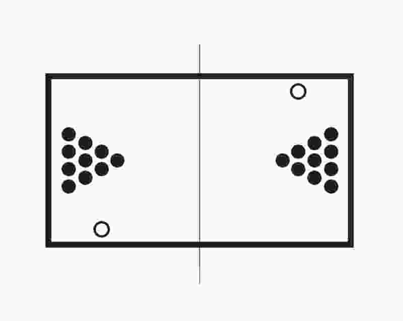 ARRANGE THE PLASTIC CUPS IN TWO TRIANGLES OF 10 CUPS EACH ON OPPOSITE ENDS OF THE TABLE WITH TIPS POINTING TOWARD THE CENTER.