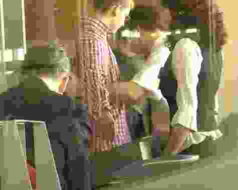 While most of the seven videos in the exhibition were displayed on monitors, Said Atabekov’s Neon Paradise (2003) was projected large against the gallery wall. In the piece, a shaman-like figure repeatedly bowed to an impersonal modern building, whose glass doors slid open and closed in response. The Kazakh artist baited the modernist structure, using props like his pointy hat and Soviet water jug to add to the absurdity of the ritual. The video lent portability and posterity to his performance, but there wasn’t much to be grasped once the tradition-meets-modernity premise was established. Vyacheslav Akhunov’s Cleaner (2007) was likewise caught up in absurd (and prolonged) rituals: the video documented the veteran Uzbek artist undertaking a “pilgrimage to the United Kingdom” to polish monuments with a toothbrush.