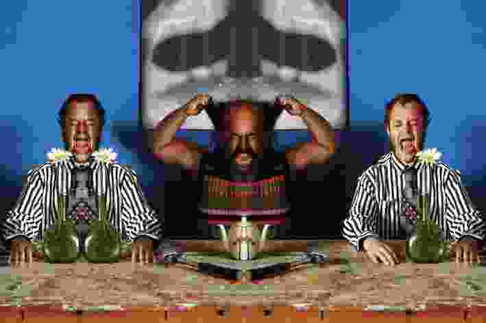 Since he started photography eleven years ago, Haerizadeh has been weaving jokes into his images but has vamped up the bittersweet humor for this exhibition. Fascinated from childhood by reflections of architecture in Persian garden pools and the phenomenon of seeing in a single frame two versions of an image, Haerizadeh continues to play with mirroring, but with more subversive results than we’ve seen before.