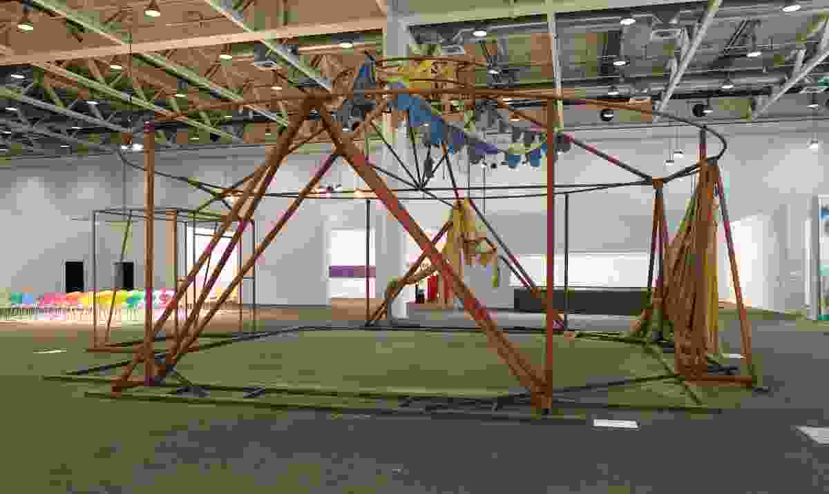 For the 2007 edition of Art Basel Unlimited, Stevenson modeled a tent on the remains Clark described — the ruins of the party at the ruins. In lieu of the original steel structure, the artist draped cardboard with artificially distressed cloth, which he embellished with pine needles, bones, and false eyelashes. Symbolically speaking, his Persepolis 2530 served as both a reckoning and a wager, infiltrating the commercial space of the art fair right at the market’s most lurid; in that moment, its impending crash seemed as likely as a 2,500-year-old empire dying over a dinner party.
