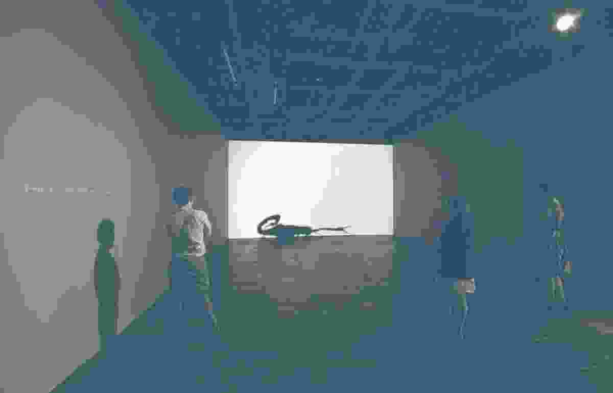 Jill Magid’s A Reasonable Man in a Box, her first solo showing at an American museum, broached questions related to legal conceptions of torture. Her setup was simple: a narrow doorway led to a dark gallery, where one wall was filled with the shadow of a huge scorpion crawling in and out of the frame. There were amplified sounds of scratching, scurrying, and tail snapping. Two spotlit wall-texts captioned the experience. The first comprised snippets of a legal document, which began: “You would like to place a man in a cramped confinement box with an insect.”