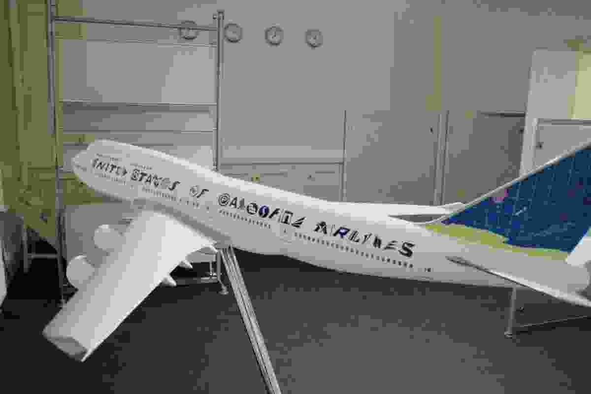 The United States of Palestine Airlines had just become a sponsor of the Palestinian Museum of Natural History and Humankind in an agreement, we were told, worth £2.5 million over five years. The museum director — Rabah himself — is thrilled. “The sheer size and scale of this deal is an amazing opportunity for us,” ran the quote in the museum’s newsletter. “We are delighted to have Palestinian Allied Airlines [sic] as our sponsor.” Naming rights to a new gallery in the museum, of course, was one of the conditions of the lucrative deal. The letters of the fictional airline’s logo were made up of the logos of existing national airlines. (Some were easily recognizable, some less so — world travelers visiting the exhibit had the advantage.)