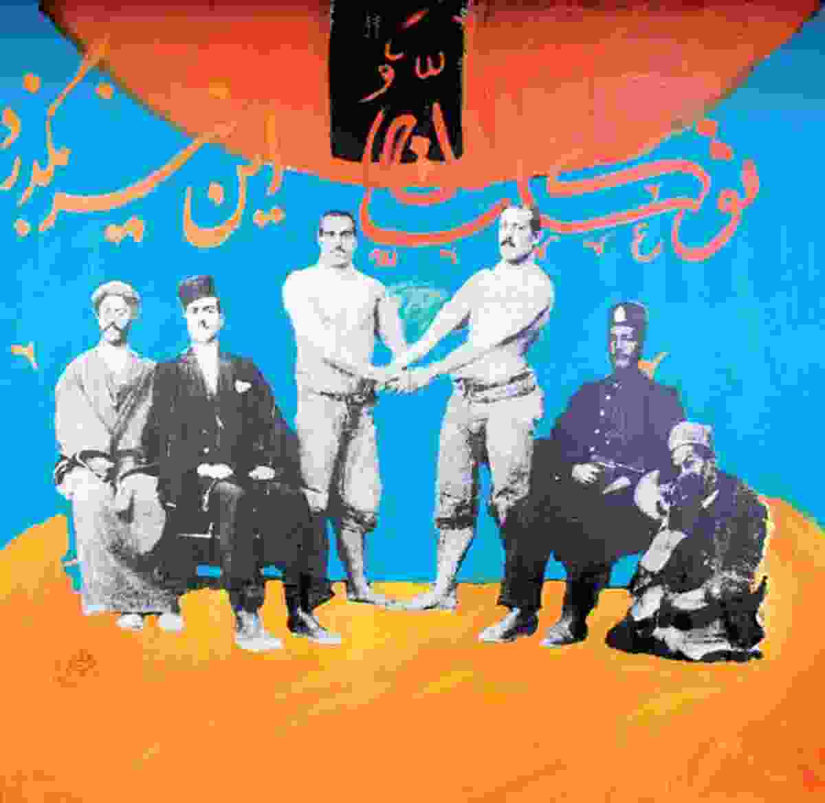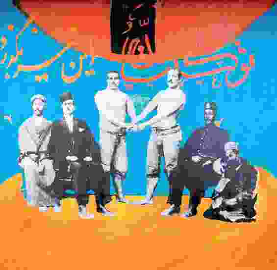 Alongside the storefront portraits was a series of vibrant large-scale paintings on canvas entitled Ya Ali Madadi — the title taken from a Sufi prayer traditionally uttered during nightlong dhikrs, when the pious would call for the support of Ali, the first imam of the Shia faith. The prayer is popular among Pahlavans and other athletes, whose quest for moral and physical strength incorporated Sufi spirituality and meditative techniques.