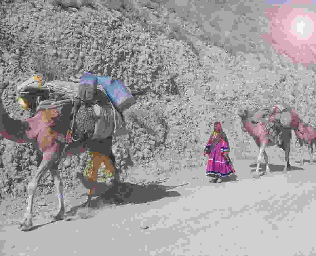 Whenever I see the Kuchis, they conjure a fantasy of unlimited freedom: no borders, no boundaries, no bonds. And what I envy about them most is that they seem to have banished the essential problem of road life — loneliness — with their collective nomadicity. Intimations of winter, time to move? Take down the tents, pack the tambourines, fold up the dresses, waistcoats, grab the goatskin sacks of water and milk. Tie it all on the camels and go. And everyone goes. It’s easy of course to romanticize the Kuchis, everyone does it. Even they romanticize their way of life as they see themselves becoming more like pariahs and refugees than proud herders and traders.