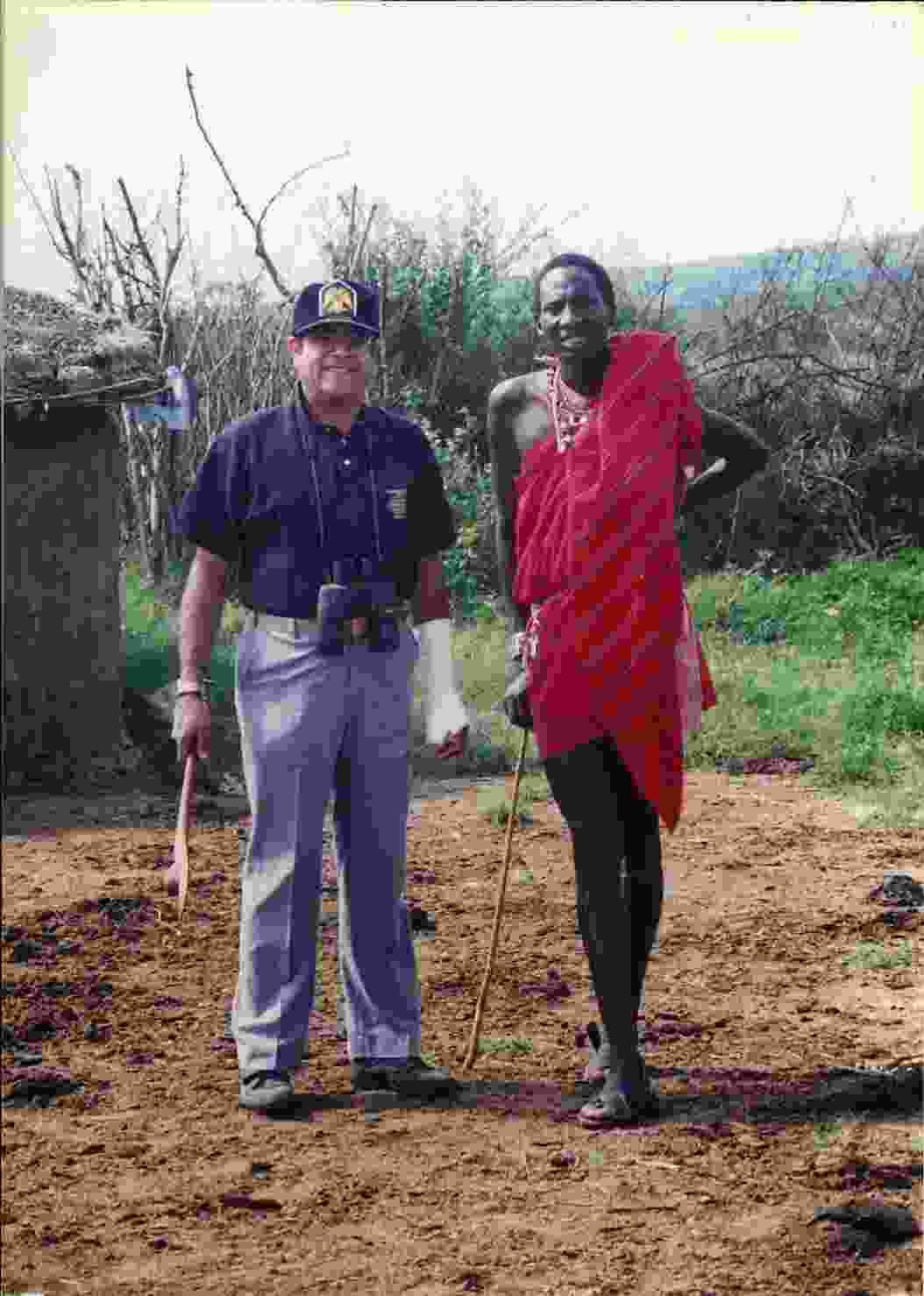 Like this. [Picks up spear and sets the base on the floor, with his foot on top, his body bent.] This is how a Masai warrior would hold the spear against a charging lion. Once upon a time, an uninitiated Masai would have to kill a lion with such a spear to become a man. The old Masai men are, in their philosophy, very similar to Brahmins and the covenant of Brahma, you know.